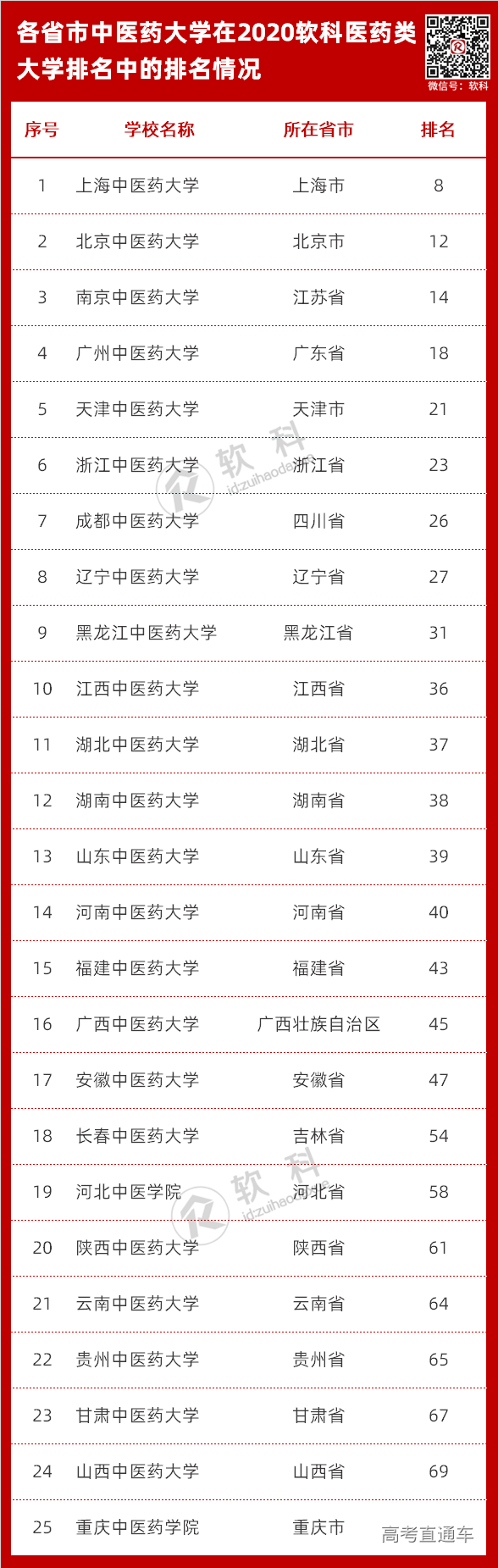 那么全国31个省(自治区、直辖市)谁还没有独立设置的中医药大学呢?小编根据教育部发布的《2019年度全国普通高等学校名单》,筛选了各省市办学层次为本科的公办中医药大学,整理了他们在2020软科医药类大学排名中的排名情况。