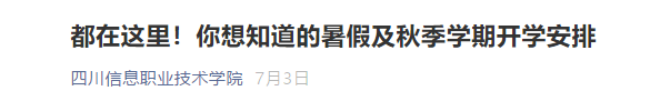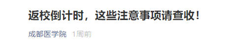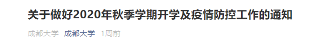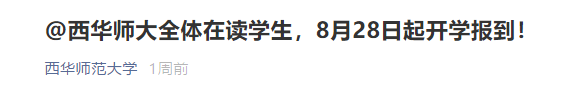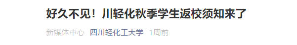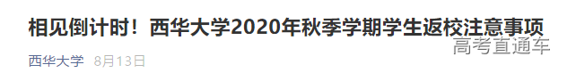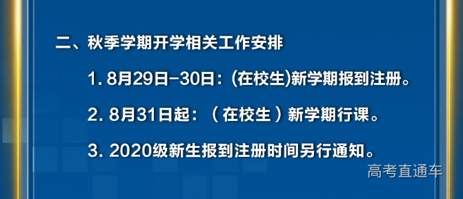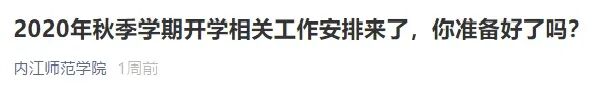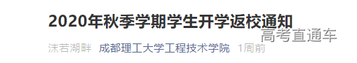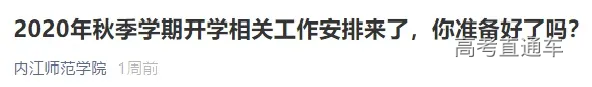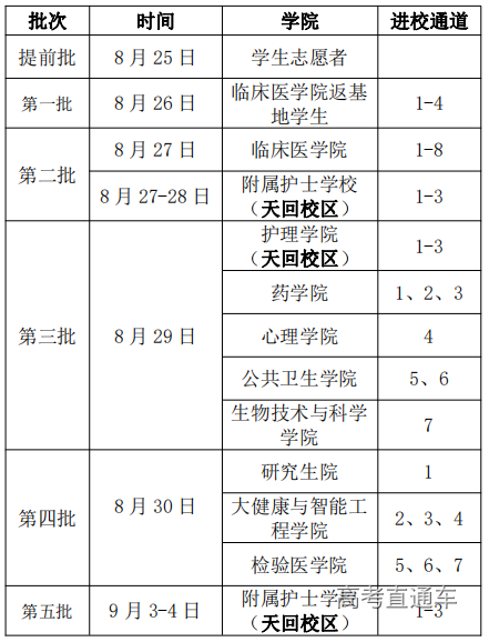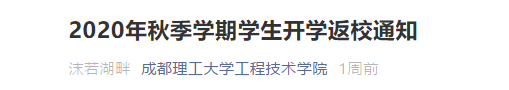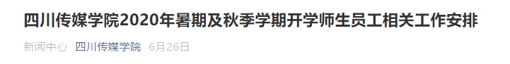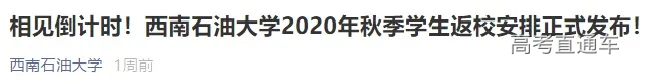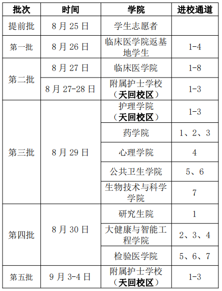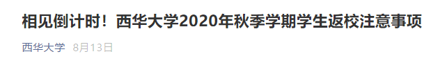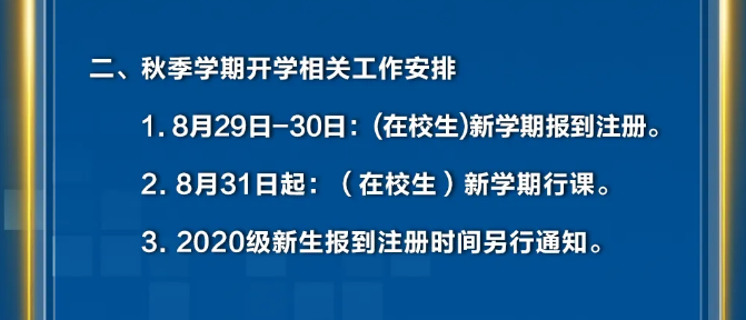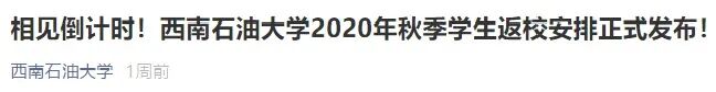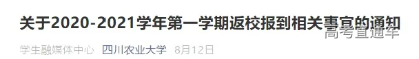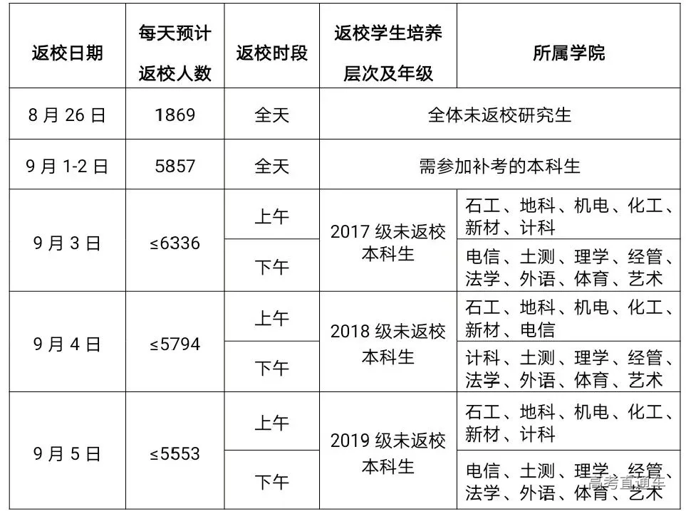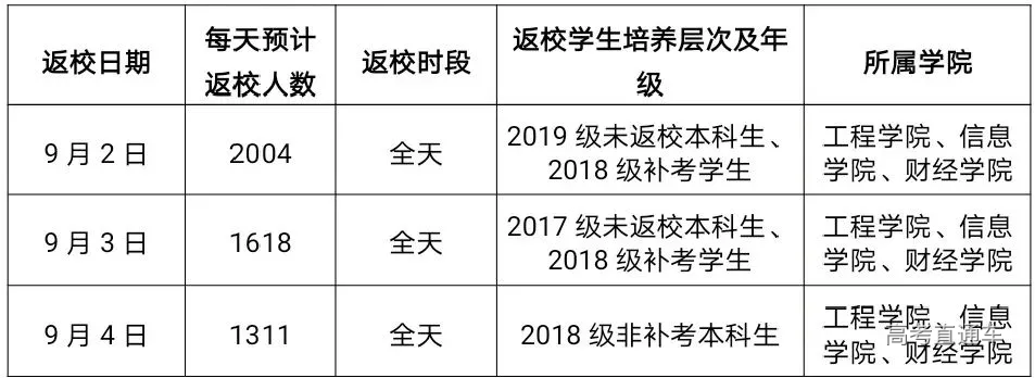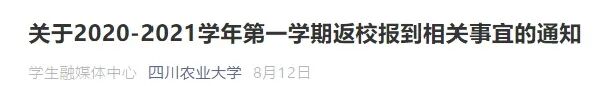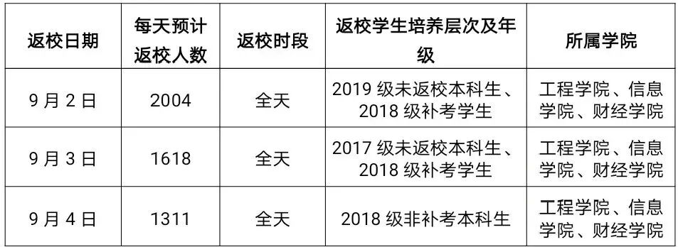 (一)校本部中国学生返校安排(老生) (二)南充校区中国学生返校安排(老生) (三)国际生返校安排 境外师生未接到学校通知一律不返校,返校时按照有关要求向学校出示核酸检测证明材料。 (三)新生报道安排 研究生新生报到时间为9月8日-9日,本科生新生报到时间为9月21日-23日,初步考虑按照先省外、后省内的方案进行安排。 8月27日起,原则上所有在读学生均须遵照学校通知分批返校(不得提前或延后返校) 1.批次 第一批:需参加第二批考试的学生 8月27、28日(周四、周五) 第二批:其他学生 9月3日、4日(周四、周五) 申请返校学生严格按照疫情防控要求进行健康监测管理,未在校学生严格实行每日健康打卡(第一批从8月13日起,第二批学生从8月20日起),如实填报返校前14天旅居史、接触史、健康史等个人情况及家人身体状态等信息; 暑期留校学生按照要求实行一日两测体温。 2020年秋季学期教职工报到上班时间为9月9日 本专科学生(不含2020级新生)报到时间为9月11日,9月14日正式行课。2020级新生报到时间为9月19日至9月20日。 为扎实做好疫情防控工作,保障广大学生的身体健康和生命安全,学校将于8月28日起,组织学生分期分批、错时错峰有序报到。 在读本科生、全日制研究生以及2018级专升本新生。报到前14天内确定为中、高风险区(县、街道和社区)的学生暂缓报到,具体报到时间另行通知。境外学生(含港、澳、台地区)按照海关和南充市疫情防控要求办理。 8月28 2019级本科生、2018级教育学院本科生 8月30日 2018级本科生、2019级研究生 8月31日 2017级本科生、2018级研究生、2017级研究生(农村教育硕士)、2018级专升本 1.教职员工 8月24日返回内江并报告所在单位; 8月28日、29日进行干部教育培训; 8月30日上午在第一学术报告厅召开中层干部会;下午各单位召开职工大会传达中干会精神,并布置本单位工作。 境外教师暂不返校。 2.全体学生 按照“疫情防控常态化、错时错峰”原则,从8月26日起安排学生分期分批返校,具体返校时间和有关要求由各二级学院通知学生本人。 2019级学生8月26日返校报到,8月27日至28日搬寝; 2018级学生8月29日返校报到,2017级学生8月30日返校报到;其中毕业年级在内江实习的学生可返校,在市外实习的学生不需返校; 在境外学生暂不返校; 9月12日至13日,2020级新生按录取通知书规定日期来校报到。 1.本科新生(含第二学士学位新生):9月21日分批报到。 2.专升本新生9月1日-3日按院系分批报到。 1.艺术学理论与管理学院艺术史论专业学生:8月31日首批返校。 2.其它学生:2018级学生9月1日-3日、2019级学生9月7日-9日、2017级及五年制2016级学生9月14日-16日按院系分批返校。 1.研一新生:9月7日-8日报到。 2.研二、研三学生:9月11日返校。 1.全校教职员工于2020年9月3日之前返校,并精准详细汇报假期内的活动轨迹,各二级学院、各部门汇总相关信息报人事处、防控办和保卫处,学校按要求向当地党委政府报告。 2.2017级-2019级学生于2020年9月4日-6日返校,且未经学校同意,学生不得提前返校。 3.2020级新生报到时间为2020年10月10日-11日 一、返校时间及报到地点 8月31日—9月1日 2017级学生、2018级专升本新生 9月2日—9月3日 2018级学生 9月4日—9月5日 2019级学生 报到地点:西校门 二、返校对象 在校生和2018级专升本新生。 其中报到前14天内居住地确定为中、高风险区(县、街道和社区)的学生暂不返校报到。 返校前14天有中、高风险地区旅行史的学生暂缓报到。必须具备返校前7天内核酸检测呈阴性的证明,且健康码为绿码,方可提出申请,审核通过后可以返校。 开学报到时间 2020级【本科】新生报到时间: 2020年9月11日 2020级【专科】新生报到时间: 2020年9月22日 1.8月27日,2020级四类扩招学生报到。 2.8月31日,2019级三年制学生报到。 3.9月1日,2020级五年制学生报到。 4.9月4日,2018级三年制、2019级五年制学生报到。 5.10月9日-10日,2020级三年制学生报到。 备注:留学生开学报到时间根据疫情情况另行通知 一、新生报到时间:9月5日。在校生分期分批、错峰返校,具体返校时间段由各二级学院通知到每位学生。 二、来自中高风险地区的同学返校时须向学校出示一周内的核酸检测报告。境外师生未接到学校通知一律不返校,返校时按照有关要求向学校出示核酸检测证明材料。 三、所有同学继续做好自我健康监测,返校前 14 天不得出川,通过钉钉健康打卡如实上报情况。 (一)教职工上班时间 2020年9月5日 (一)学生报到时间 1.老生报到时间 成都校区:9月7日一9月11日老生上网课,9月14日返校报到。 德阳校区:9月5日一9月6日老生返校报到,9月7日正式行课。 2.新生报到时间 成都校区:三年制大专新生10月11日(星期日)到校报到;五年高职转入大专学生9月7日一9月11日,在家上网课(具体安排另行通知),9月14日(星期一)到校报到。 德阳校区:三年制大专新生1 0月1 0曰(星期六)报到。 新生凭录取通知书时间报到。