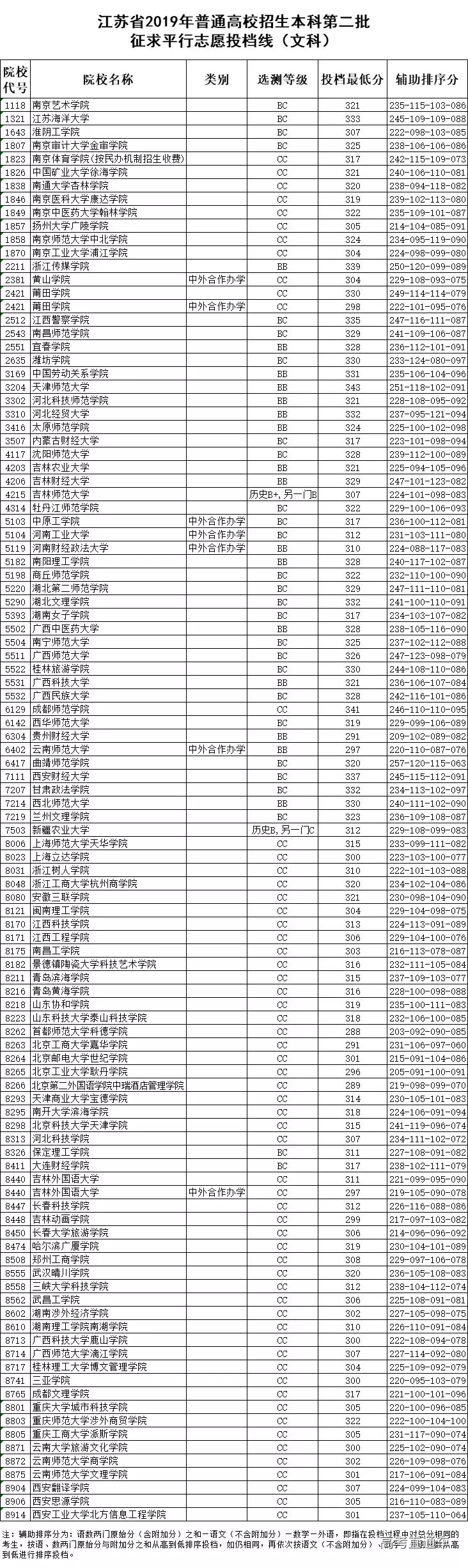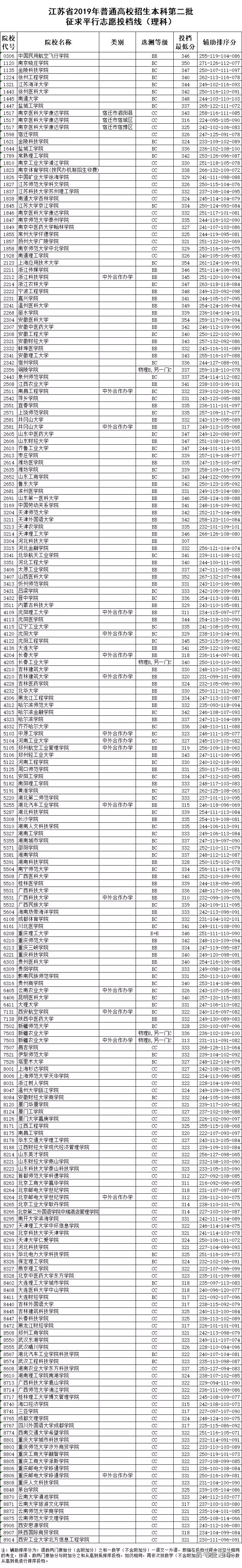 江苏省2019年普通高校招生本科第二批征求平行志愿投档线