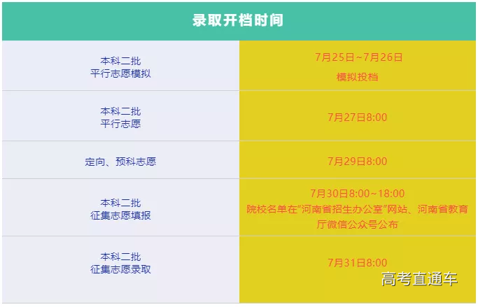 本科二批(含定向、预科)征集志愿,本批征集志愿信息将于7月30日凌晨发布在河南省阳光高考微信公众号(yggaokao)上。