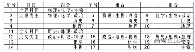 2020年高考录取总成绩由统一高考成绩(语文、数学、外语3门必选科目,每门满分150分)和高中学业水平等级性考试科目成绩(物理、化学、生物、历史、地理、政治6门中任意选择3门,每门满分100分)组成。从6门科目中选考3门,运用排列组合公式计算得出答案是20种,以原理工类科目(物理、化学、生物)、文史类科目(历史、地理、政治)进行分类统计如下: