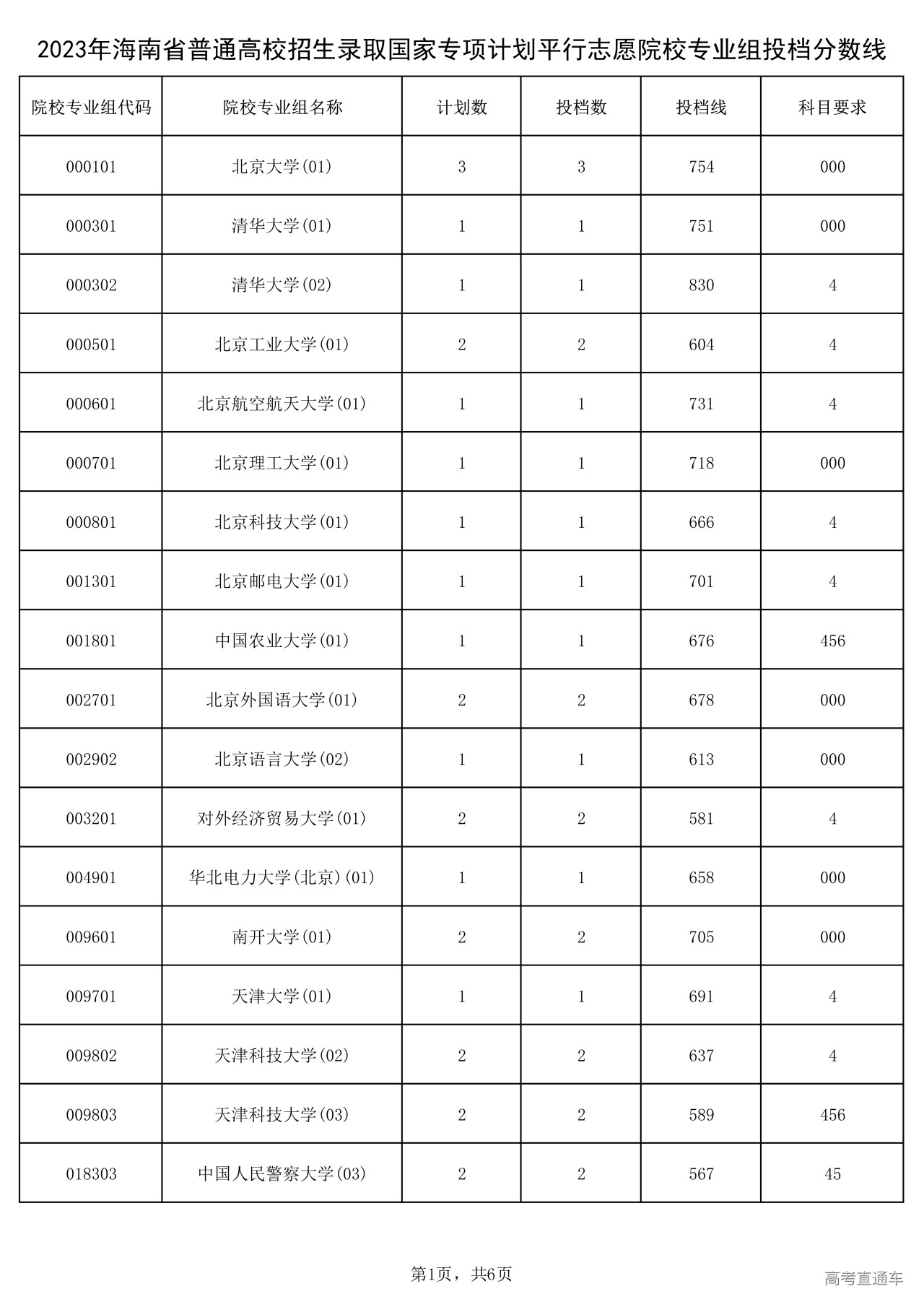 2023年海南省普通高校招生录取国家专项计划平行志愿院校专业组投档分数线