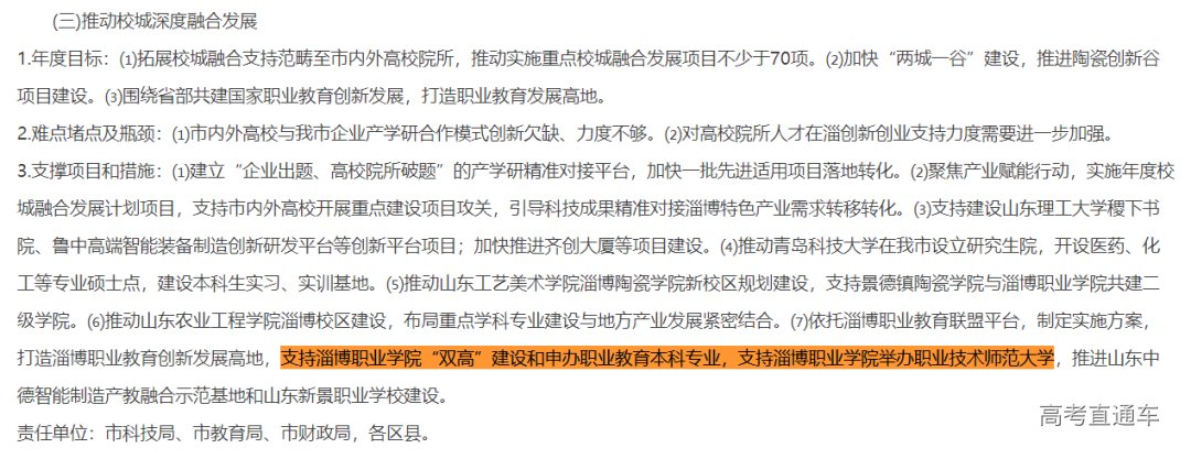 根据方案,在科教创新攻坚行动中,淄博市将依托淄博职业教育联盟平台,制定实施方案,打造淄博职业教育创新发展高地,支持淄博职业学院“双高”建设和申办职业教育本科专业,支持淄博职业学院举办职业技术师范大学。
