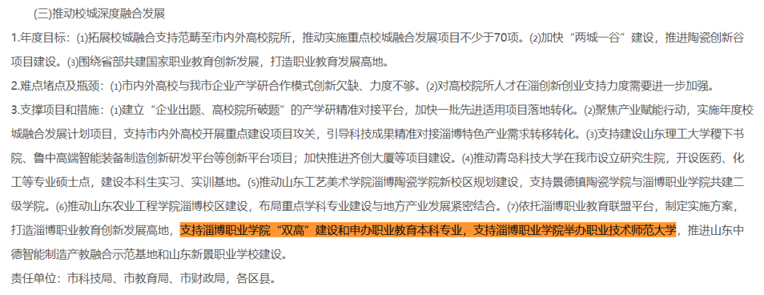 此外,淄博市“十二大攻坚行动”实施方案还提到了推动青岛科技大学在淄博市设立研究生院,开设医药、化工等专业硕士点,建设本科生实习、实训基地;推动山东工艺美术学院淄博陶瓷学院新校区规划建设,支持景德镇陶瓷学院与淄博职业学院共建二级学院;推动山东农业工程学院淄博校区建设,布局重点学科专业建设与地方产业发展紧密结合;推进山东中德智能制造产教融合示范基地和山东新景职业学校建设;支持建设山东理工大学稷下书院;加快推进齐创大厦等项目建设;加强与山东第一医科大学战略合作,重点推进管理学院、医养结合战略研究院等7个项目。