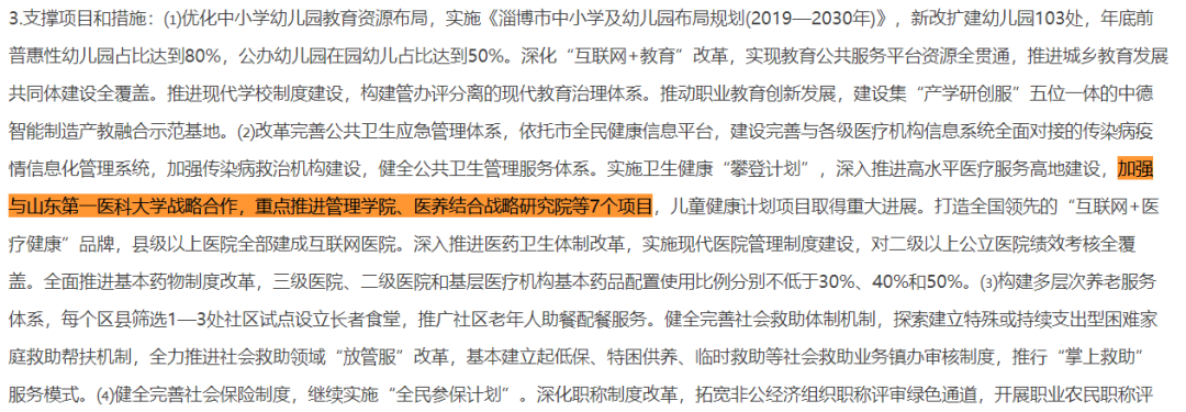2019年11月3日,淄博市人民政府与山东第一医科大学签署战略合作框架协议,双方达成了山东第一医科大学淄博医院项目、山东第一医科大学医院管理学院项目、医养结合战略研究院项目、儿童健康计划项目、重点专科建设项目、高层次人才培养项目、基层医疗卫生人才教育合作项目七大合作内容。