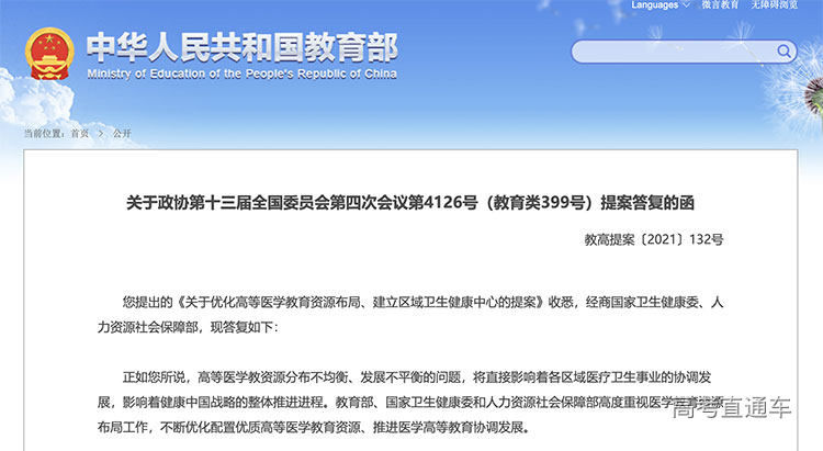 近日,教育部网站发布对《关于优化高等医学教育资源布局、建立区域卫生健康中心的提案》的答复。答复中提到,教育部积极支持中西部“双一流”高校利用多学科优势,快速发展医学学科。在学位授权审核工作中,教育部对西部地区院校给予政策倾斜,相关院校在申请新增博士、硕士学位授予单位和学位授权点时,申请条件可降低20%,并把增列事关人民健康的医学类博士点、硕士点作为主要政策导向,为西部地区加快培养高层次医学人才奠定了基础。