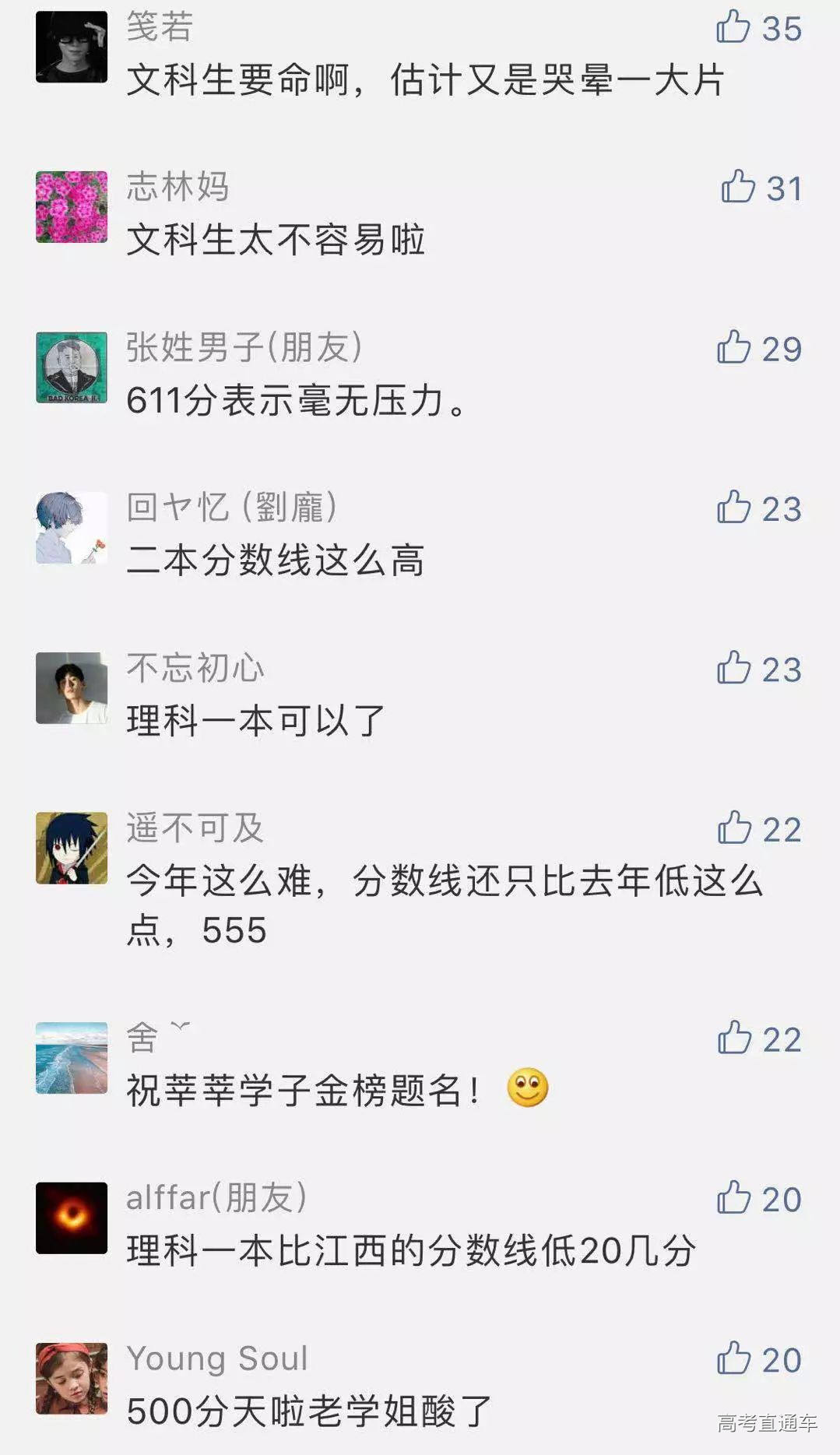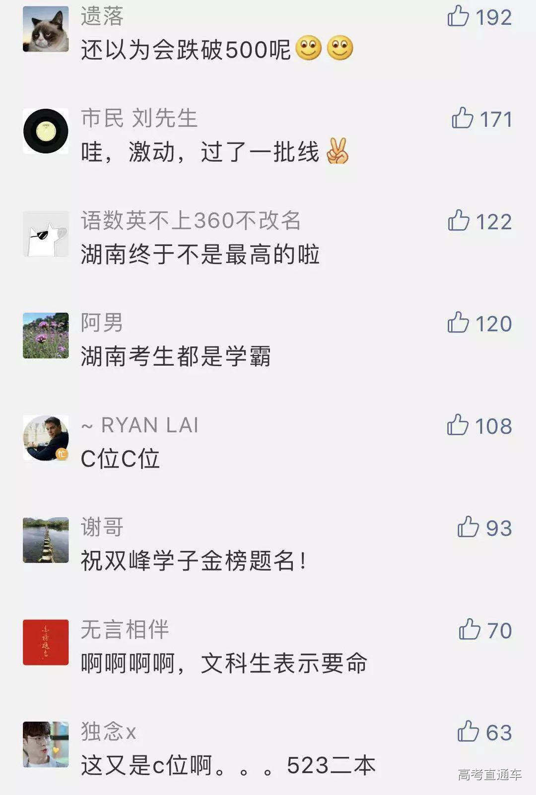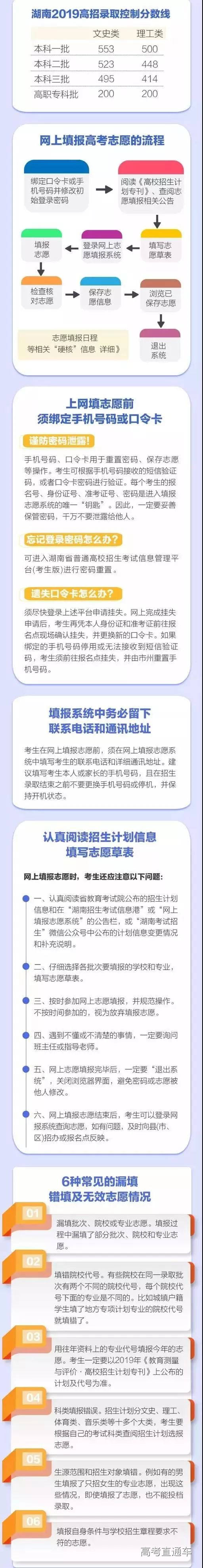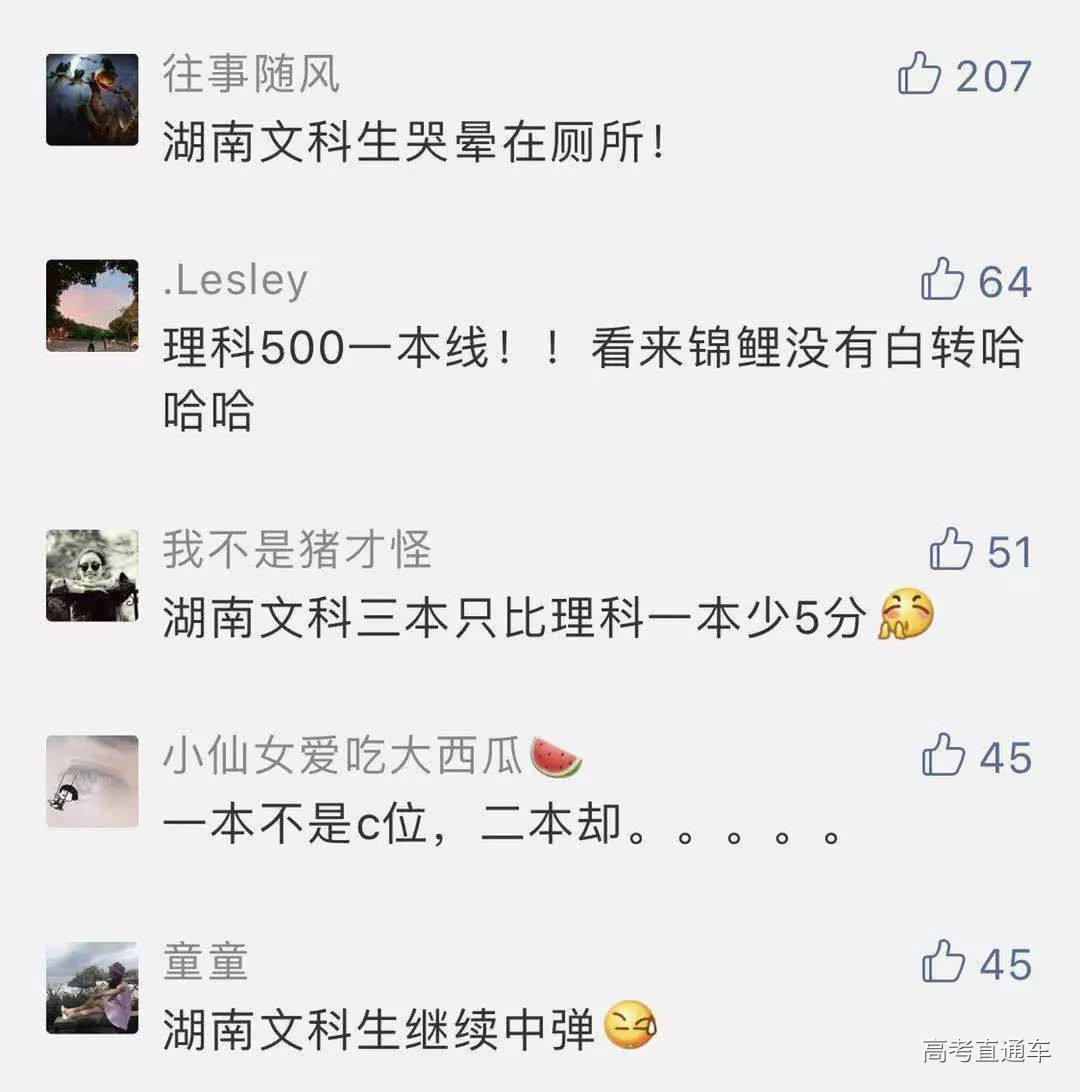 成绩公布后, 一众网友,开始了热烈地讨论。 那么,今年湖南考生的整体情况如何呢? 分数线相比去年是否有所升降? 我省今年高考所有科目继续使用全国卷。 今年文化总分600分以上的考生10131人(去年17052人),其中文科类为2693人(去年5538人),理科类为7438人(去年11514人)。 2019年,我省共有高考考生49.9万人,比上年增加4.7万人。其中,应届生44.3万人,占考生总数的88.8%,往届生5.6万人,占11.2%;文科考生18.5万人,占37.1%,理科考生24.0万人,占48.1%,职高对口类考生7.4万人,占14.8%。 与去年相比,语文、外语和文科综合的平均分有所上升,文科数学、理科数学、理科综合的平均分有所下降。 各科目平均分数为:语文100.99分(去年98.16分),外语87.36分(去年85.63分),文科数学72.53分(去年76.90分),理科数学84.46分(去年86.81分),文科综合180.51分(去年176.47分),理科综合158.57分(去年161.75分)。 人均文化成绩(高考文化总分+优惠分)分别为文科类437.16分(去年431.29分),理科类437.12分(去年438.83分)。 成绩公布后, 高考生开始忙碌起志愿填报这件大事, 在人生的重大选择面前, “报得好”和“考得好”同等重要。 下面这个信息关乎志愿填报, 请考生收藏!