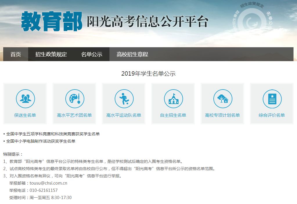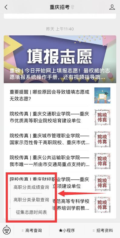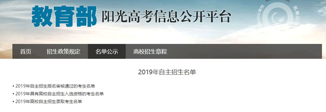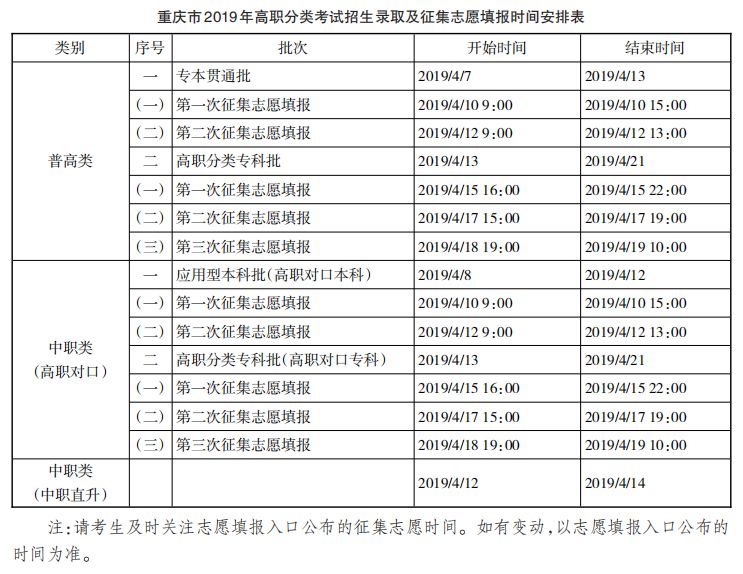■ 高职分类考试招生进入投档录取环节; ■ 自主招生初审名单月底前公布; ■ 各省陆续公布2019年招生工作规定; ■ 2019年特殊类型名单公示。 高职分类考试招生进入投档录取环节 2019年高职分类考试招生将在下周进入投档录取环节,录取工作将在4月底前完成。 录取正式开始后即可通过重庆招考微信公众号一键便捷查询自己的录取轨迹,投档到了哪所院校?录没录取?掏出手机就能查! 此外,同学们还需要牢记征集志愿时间安排,还没有查询到已经被高校“录取”信息的考生,都可以填报征集志愿,给自己多提供一个被录取的机会。但考生第一次所填的志愿优先,征集志愿在后,只要被第一次填报的院校录取了,征集志愿即为无效志愿,不会再投档。征集志愿的填报不会影响第一次所填志愿的录取。 自主招生初审名单4月底前公布 按照2019年自主招生进程安排,高校会在本月审核学生材料,在4月底前陆续公示初审通过学生名单。参加了自主招生报名的同学,需要及时登录阳光高考信息公开平台或院校官网查询公示信息。 各省陆续公布2019年招生工作规定 招生工作规定是本省市高考工作的指导性文件,对志愿填报、考试、录取、照顾加分等方面做出了详细要求,是考生和家长必须了解的政策。 5月下旬,我们将对重庆市的高招政策、规定汇编成册,并邀请招考专家对考生关心的热点问题做解答,为考生们提供志愿填报指导,请同学们关注5月下旬由重庆大学出版社出版发行的《填报志愿指南》一书。 2019年特殊类型学生名单公示 保送生名单、高水平艺术团名单、高水平运动队名单、自主招生名单、高校专项计划名单等均在教育部阳光高考信息公开平台进行公示。 目前,2019年保送生资格名单已经开始公示,其余名单也将陆续公示,请关注。