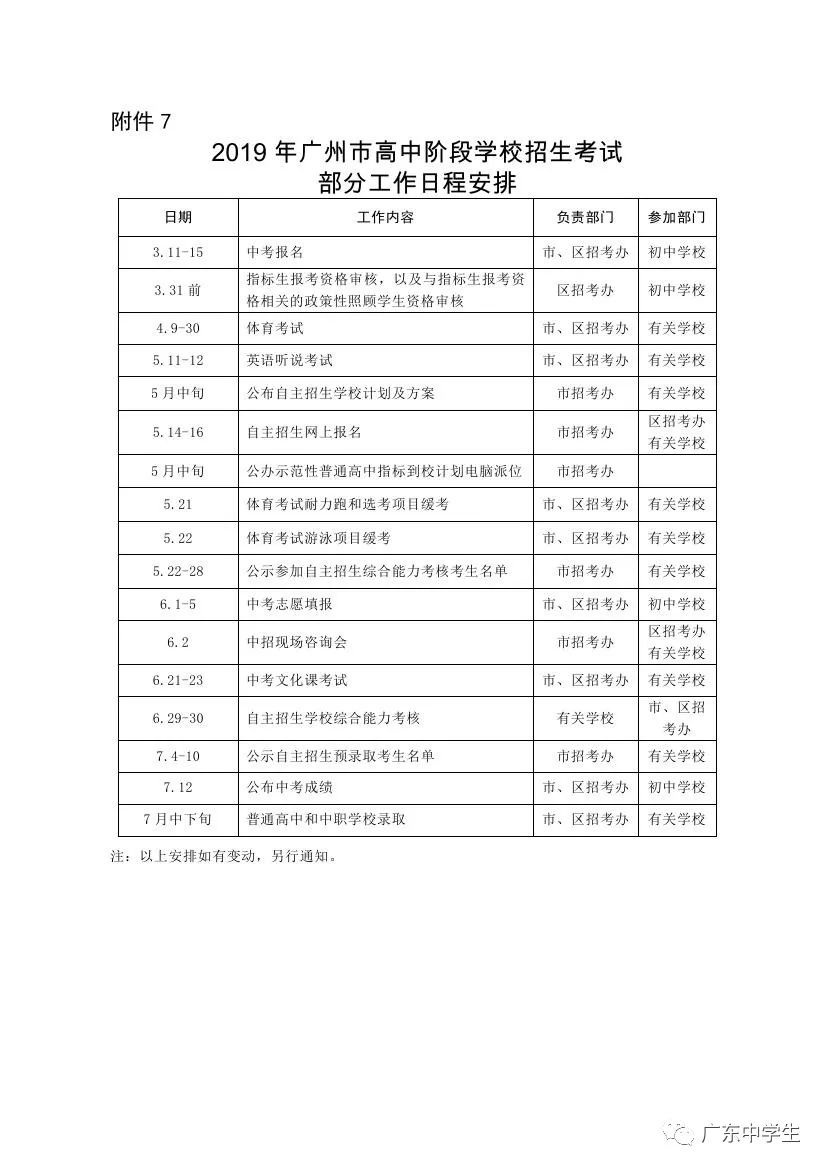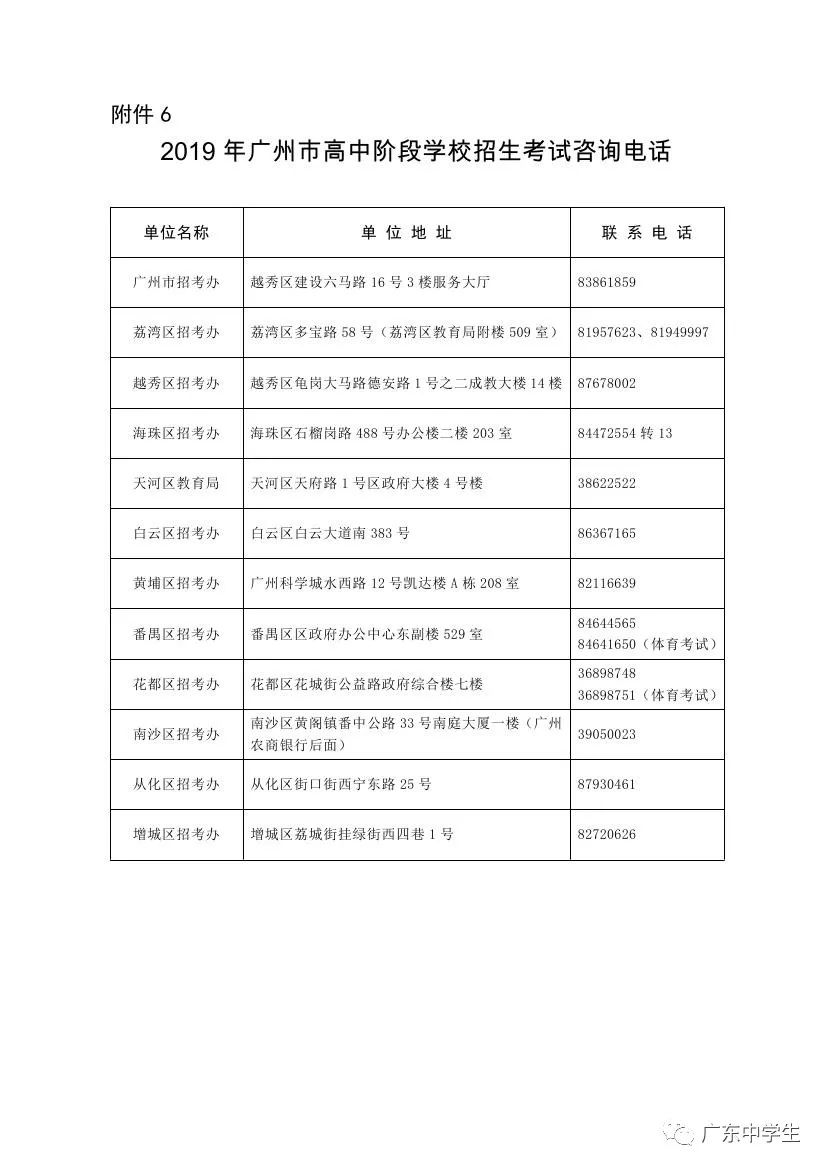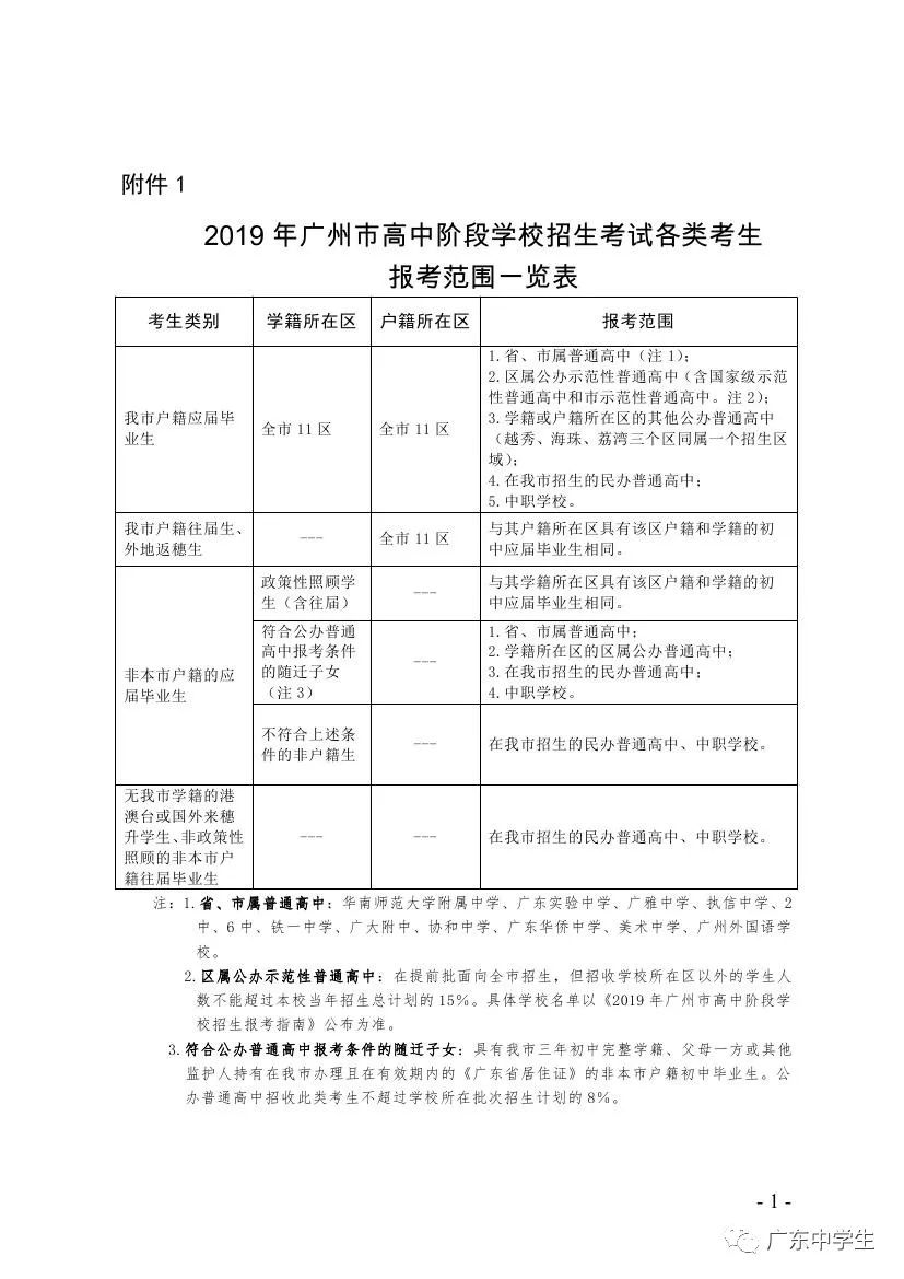 根据省教育厅、省人力资源和社会保障厅、省招生委员会有关做好全省高中阶段学校招生工作的精神和《广州市教育局印发<关于2019年至2020年广州市高中阶段学校考试招生的工作意见>的通知》(穗教规字〔2018〕5号)、《广州市教育局印发<关于2019年至2020年来穗人员随迁子女参加高中阶段学校考试招生工作的实施方案>的通知》(穗教规字〔2018〕6号)、《广州市教育局印发<关于2019年至2020年示范性普通高中学校部分招生指标直接分配到初中学校的实施办法>的通知》(穗教规字〔2018〕7号)等文件精神,为做好我市2019年高中阶段学校招生考试(简称“中考”,下同)报名工作,确保招生工作的顺利进行,现就有关工作通知如下: