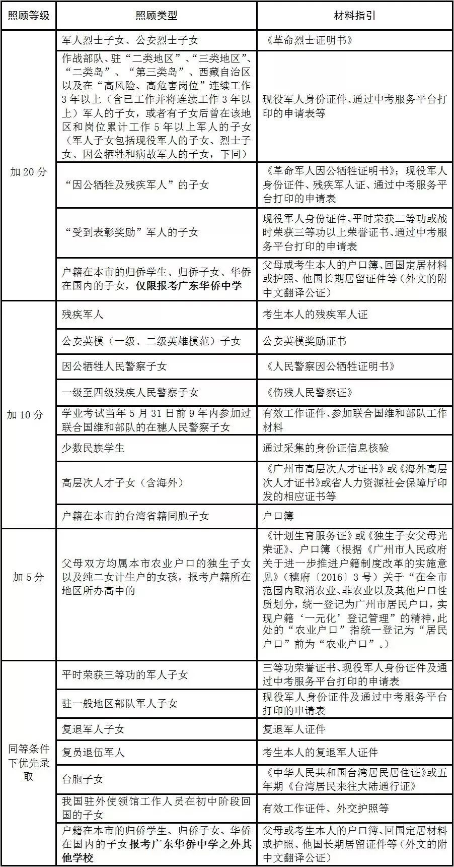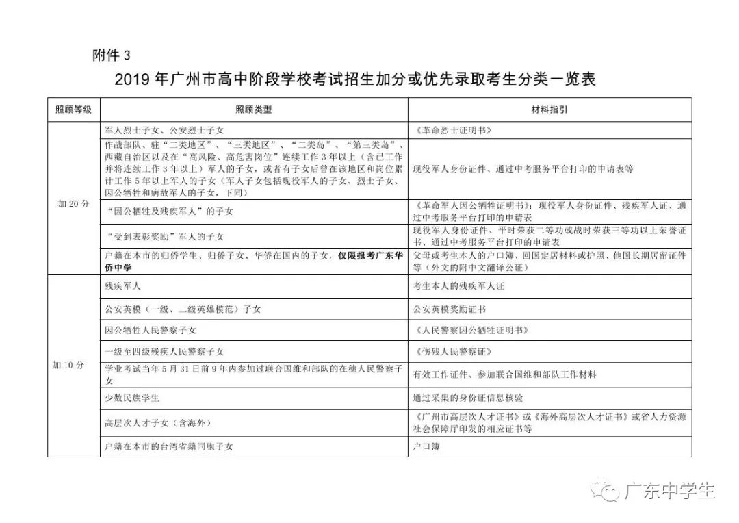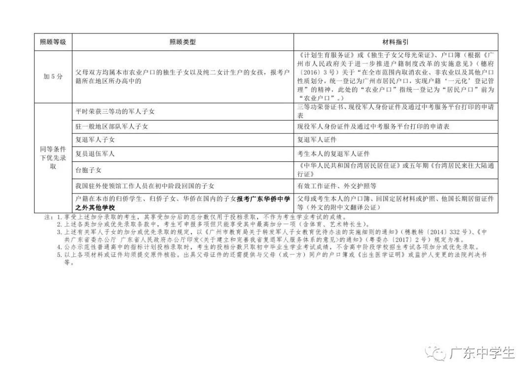 3.上述有关军人子女的加分或优先录取的规定,以《广州市教育局关于转发军人子女教育优待办法的实施细则的通知》(穗教转〔2014〕332号)、《中共广东省委办公厅 广东省人民政府办公厅印发<关于建立和完善我省复退军人服务体系的意见>的通知》(粤委办〔2017〕2号)规定为准。