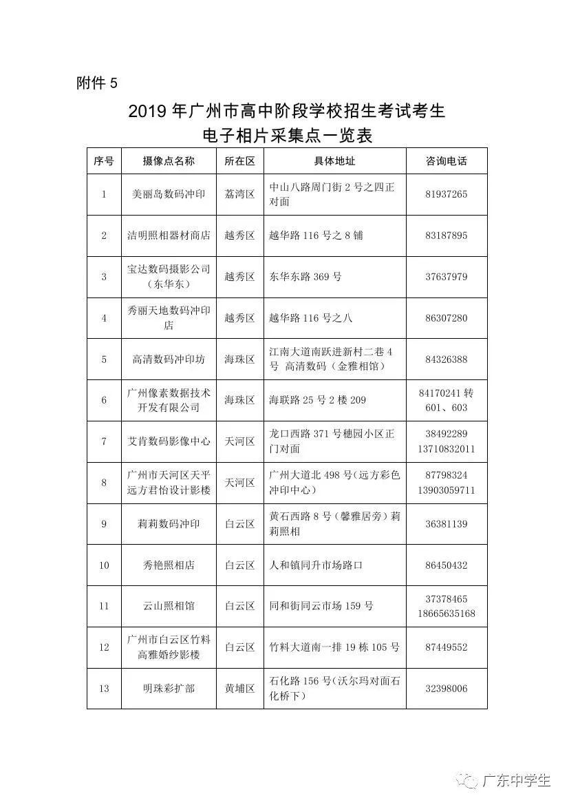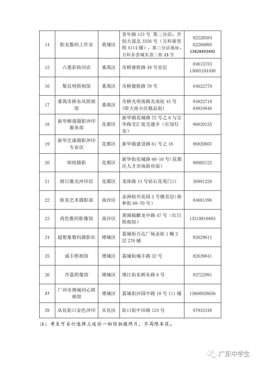 我市应届毕业生由学校安排经区招考办(基教科)指定的照相馆统一拍摄电子相片,往届生、外地返穗生、港澳台及国外来穗升学生凭考生号到指定的照相馆拍摄电子相片(见附件5)。