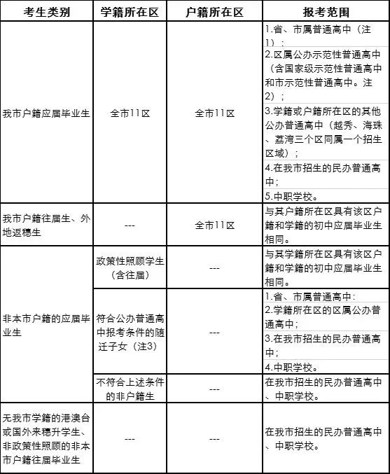 (三)我市户籍的往届生、外地返穗生的报考范围与其户籍所在区具有该区户籍和学籍的初中应届毕业生相同。