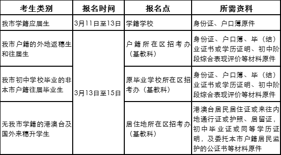 (二)我市户籍的往届生和外地返穗生于3月13日至15日凭身份证、户口簿、毕(结)业证书或学历证明、初中阶段综合表现评价等材料原件到户籍所在区招考办(基教科)报名。