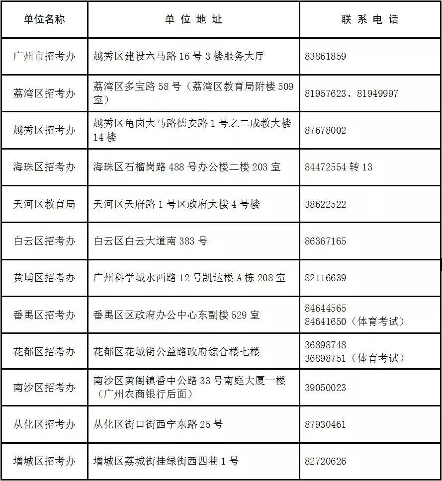 我市各类考生具体报考范围、各类升学资格申报所需条件和材料以及相关报名要求,考生可通过广州招考网、“广州招考”官方微博和微信查阅,市招考办也将第一时间通过上述渠道发布各类中考资讯。考生还可直接咨询市招考办或所在区招考办(基教科)。