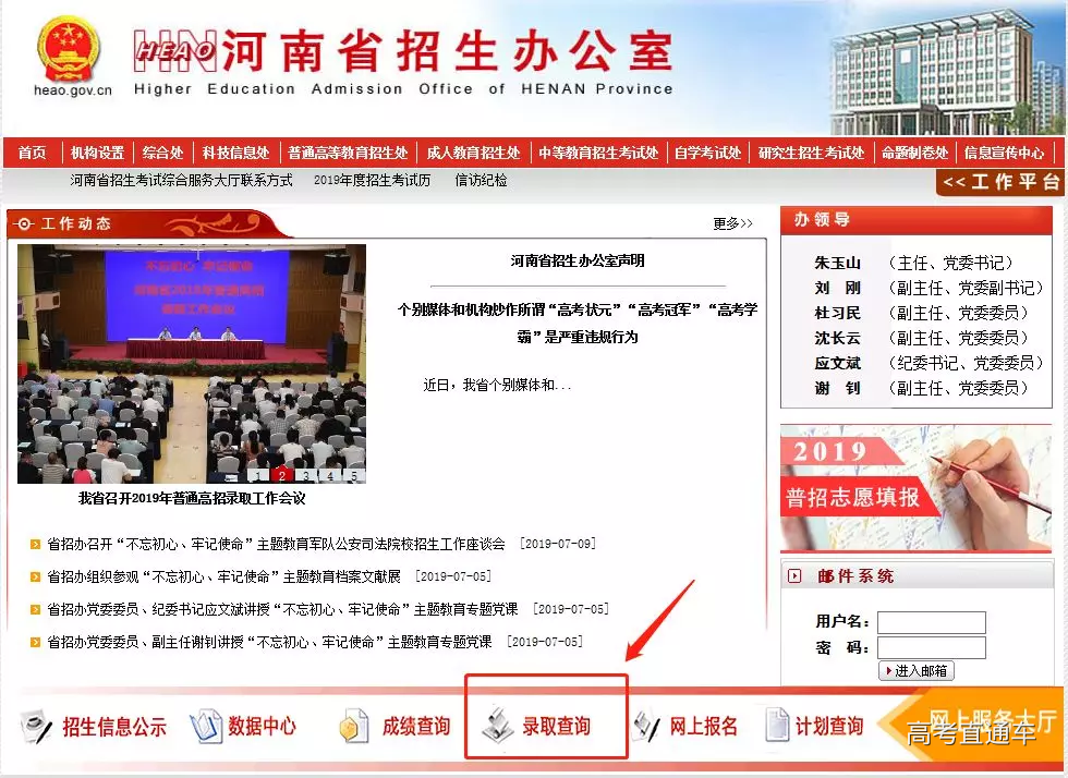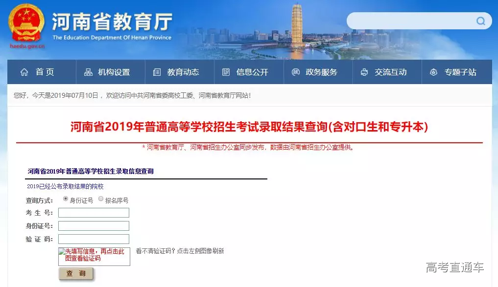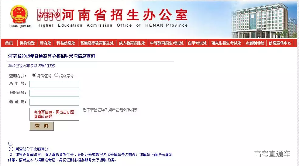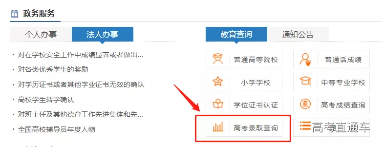 2、河南省教育厅网站 进入河南省教育厅(http://www.haedu.gov.cn/)点击“教育查询”中的“高考录取查询”。
