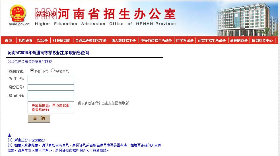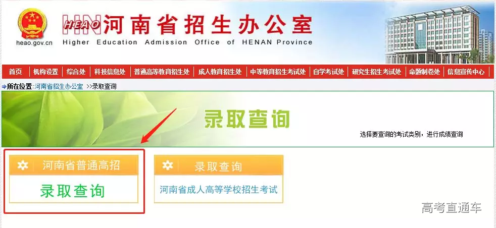 录取查询方式 1、河南省招生办公室 考生登录河南省招生办公室(http://www.heao.gov.cn/),点击“录取查询”。