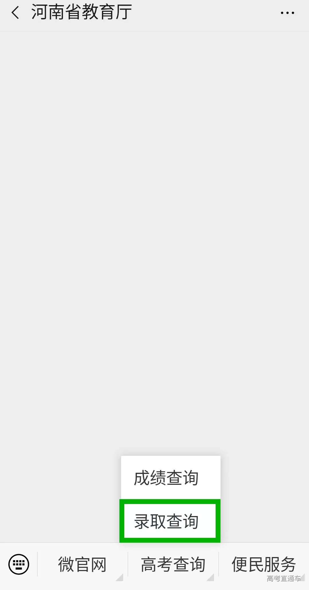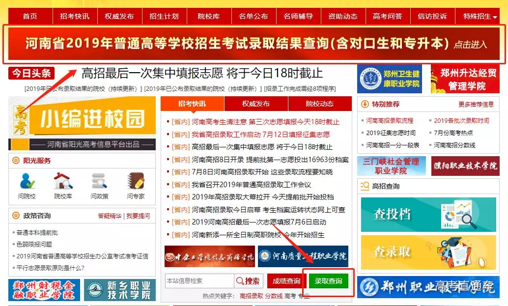 3、河南阳光高考信息平台 进入河南阳光高考信息平台(http://gaokao.haedu.cn/),点击上方头部横幅图片,或者点击页面中下方的“录取查询”。 4、“河南省教育厅”微信公众号 关注“河南省教育厅”微信公众号,点击菜单栏“高考查询”中的“录取查询”,可以轻松在线查询!