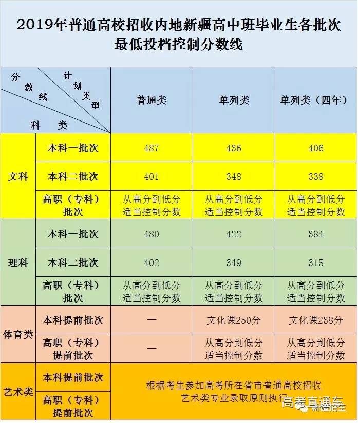 根据2019年普通高校招收内地新疆高中班毕业生各招生计划类型的计划数、考生成绩、录取投档方式等因素,自治区教育厅审议确定了2019年普通高校招收内地新疆高中班毕业生各批次最低投档控制分数线(见下表),现正式公布。
