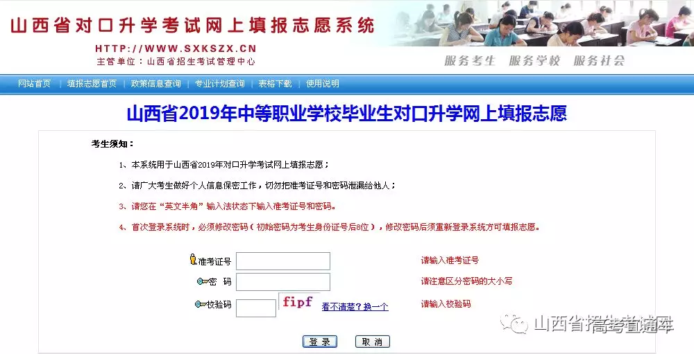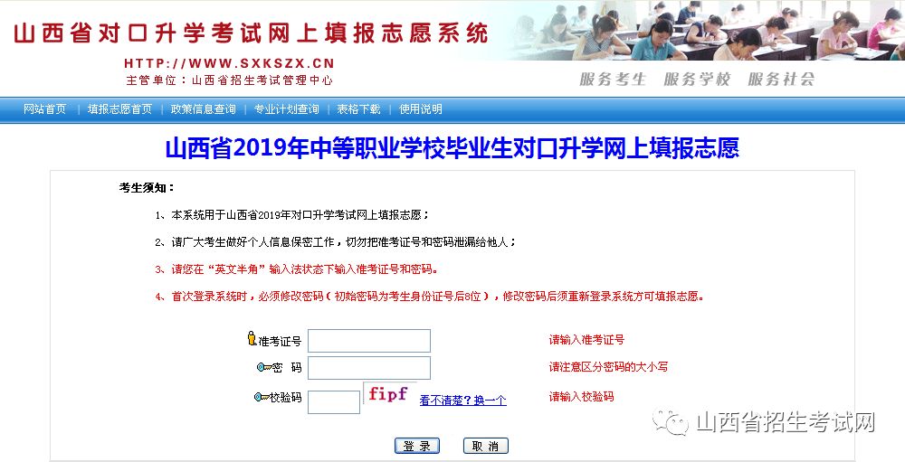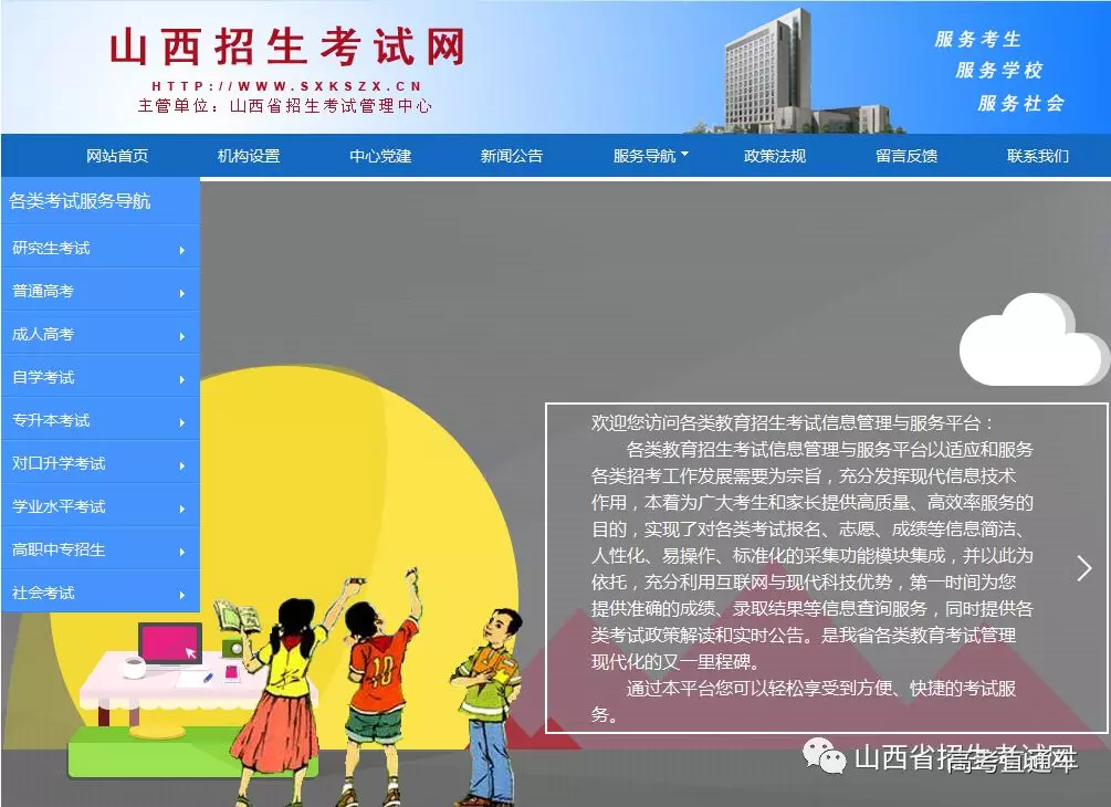 山西招生考试网(http://www.sxkszx.cn)是山西省各类教育招生考试信息发布、信息采集的重要平台,是山西省对口升学考试网上填报志愿的唯一网站。