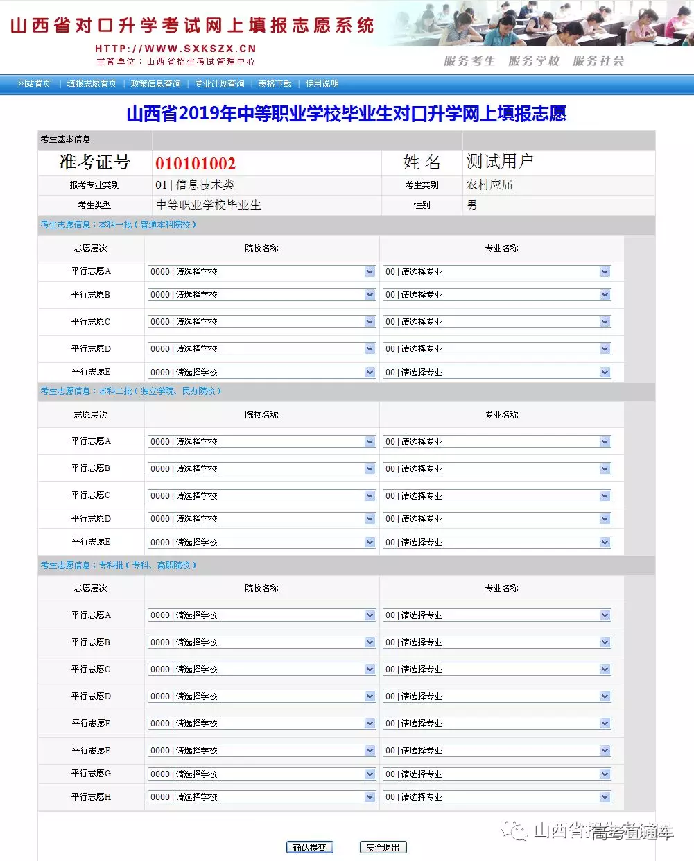 确认提交成功后,在规定时间内,考生可查看、修改自己已填报的志愿。如确认自己所报志愿无误,考生应点击“安全退出”按键,退出志愿填报系统,谨防他人篡改自己的志愿。