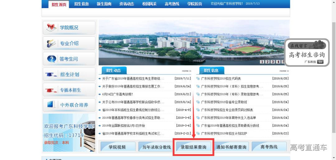①点击菜单“招生资讯”——“录取查询”,输入准考证号码或者身份证号码即可查询。 ②在“广东科技学院招生办”微信公众号后台输入“录取”,再输入准考证号码或者身份证号码即可查询。
