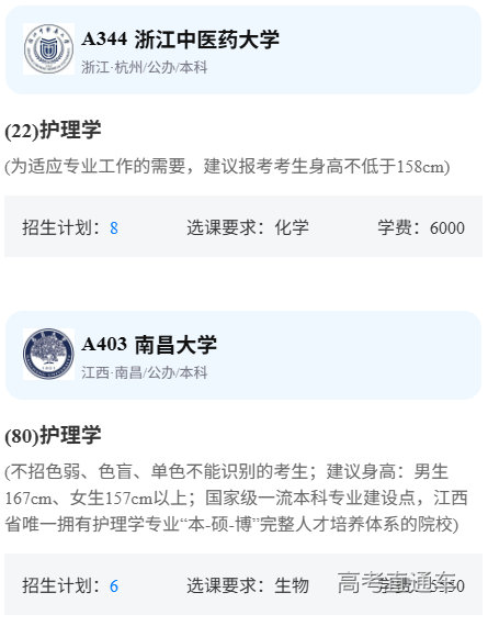 比如浙江中医药大学和南昌大学的护理学要求身高158cm、157cm以上。广州新华学院护理学对面部有要求。