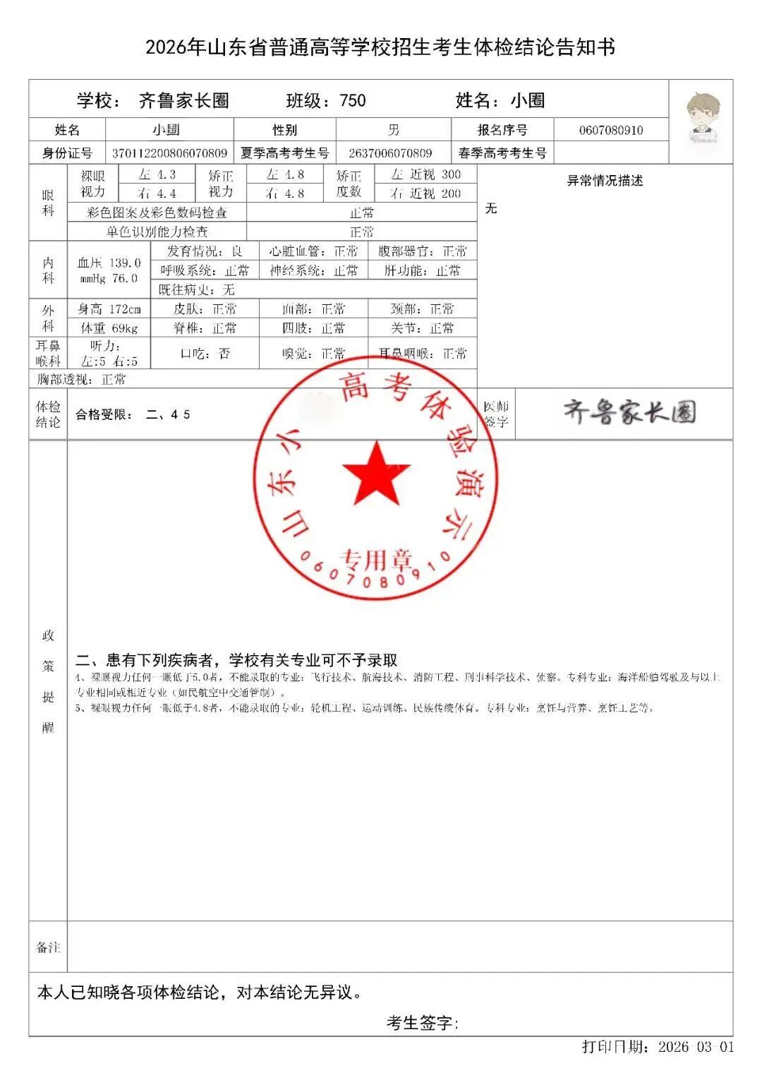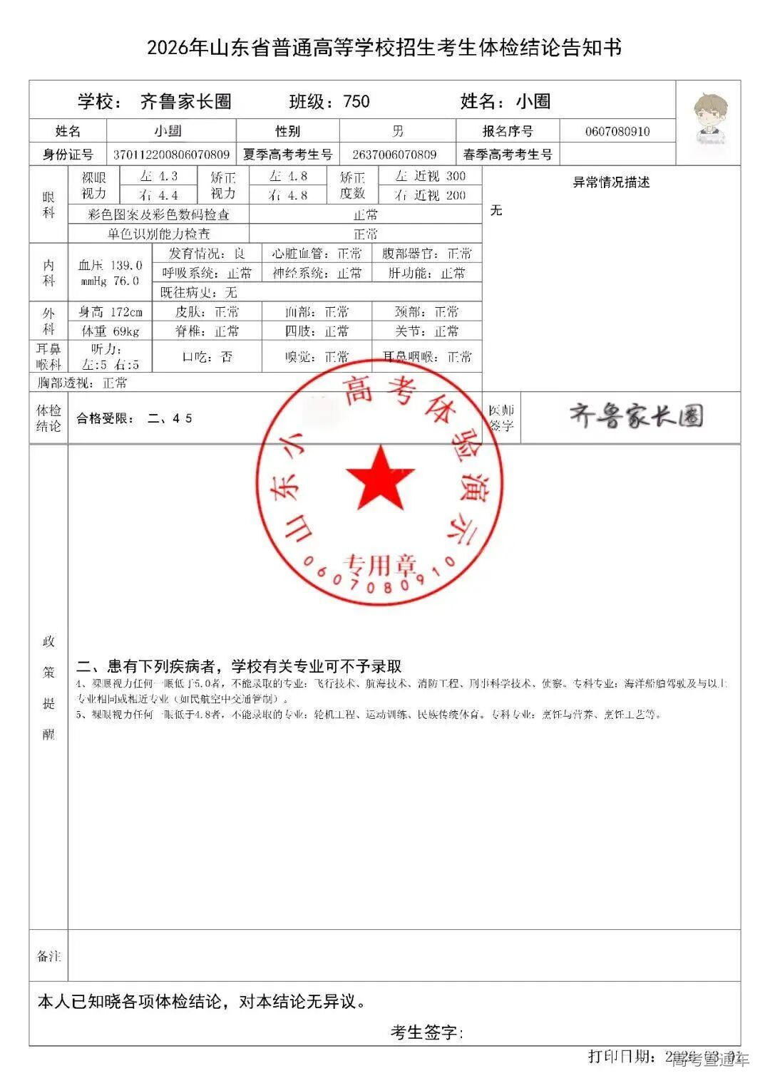 当考试体检完成后,会收到一份体检结论告知书。里面详细记录了你的体检情况。