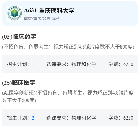 比如说重庆医科大学的临床医学、临床药学不招收色盲色弱。并且要求矫正4.8且不大于800度。