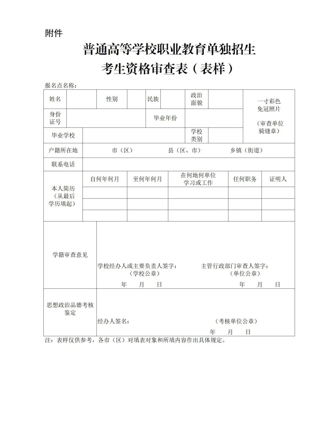 二、报名时间及办法 (一)报名时间:2024年11月1日9∶00至11月7日17∶00,报考者登录陕西省教育考试院门户网站(网址:https://www.sneea.cn)或陕西招生考试信息网(网址:https://www.sneac.com)完成网上报名程序,逾期未报名者责任自负。 陕西省教育考试院门户网站 (网址:https://www.sneea.cn) 陕西招生考试信息网 (二)我省应、往届“三校生”在学籍注册(毕业)学校所在市(区)指定的报名点报名,往届“三校生”也可在户籍所在市(区)指定的报名点报名。报考者应于报名前到报名点领取《普通高等学校职业教育单独招生考生资格审查表》(表样见附件),准确填写个人信息,并接受报考资格审查。 (三)按照教育部高考考生数据报送规范和《关于普通高校招生考试报名使用第二代居民身份证的通知》(陕教考〔2011〕3号)和要求,报名期间报考者本人必须到报名点采集第二代居民身份证信息和本人正面免冠彩色头像,考生头像采集规范及标准按照《普通高等学校招生图像采集规范及信息标准》执行。 (四)资审合格并采集信息后,报考者持本人报名条登录陕西省教育考试院门户网站或陕西招生考试信息网,进入网上报名系统,查验本人姓名、性别、身份证号等信息,认真阅读《考生须知》《2025年普通高校招生考试考生诚信承诺书》《国家教育考试违规处理办法》和《中华人民共和国刑法》有关条款,同意履行诚信承诺后输入报名信息。 (五)按照《陕西省发展和改革委员会 陕西省财政厅关于我省普通高校招生考试收费有关事项的通知》(陕发改价格〔2024〕1807号)文件要求,普通高校招生考试费按考试科目收取,收费标准为每生每科27.5元。报名考试费通过网上银行或微信支付缴纳,缴费成功后方可办理确认等报名后续环节手续。网上缴费时间:2024年11月1日9∶00至11月7日17∶00。 (六)2024年11月17日前,对考生进行思想政治品德考核。在校生的思想政治品德考核由所在学校指定专人输入网上报名系统,非在校生由其工作单位(无工作单位的由乡镇、街道办事处)作出鉴定。县(区、市)要指定专人将非在校生和在户籍地报名考生的思想政治品德鉴定内容输入网上报名系统。考核表原件留存备查。 报名、思想政治品德考核、体检等环节工作,参照《陕西省教育考试院 陕西省招生委员会办公室关于做好2025年陕西省普通高校招生考试报名工作的通知》执行。
