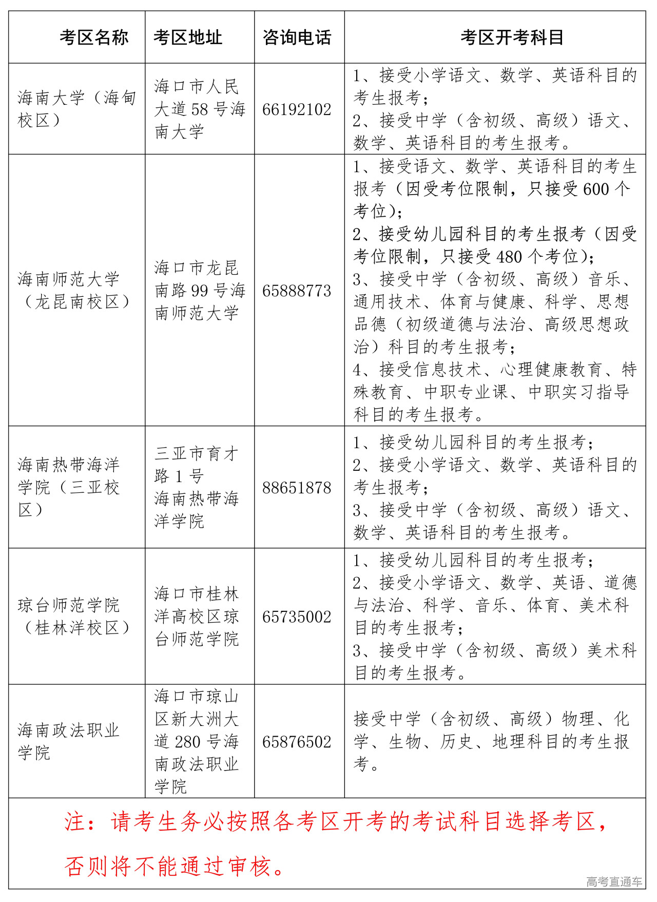 我省2023年上半年中小学教师资格考试(面试)共设海南大学(海甸校区)、海南师范大学(龙昆南校区)、海南热带海洋学院(三亚校区)、琼台师范学院(桂林洋校区)和海南政法职业学院五个考区,报名结束后各考区根据实际报名情况设置考点,考生参加考试的考点名称与地址以准考证上的为准。现将考区信息公布如下: