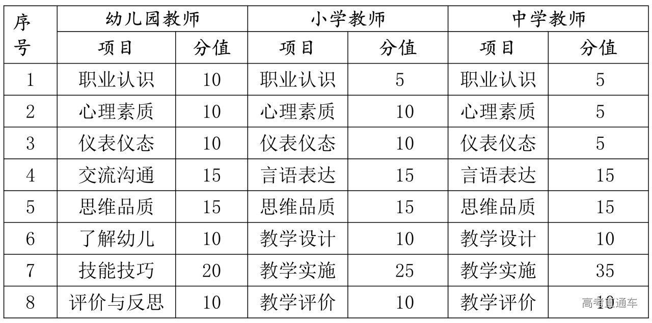 中小学教师资格考试面试满分100分,各项目分值具体如下(中职教师面试分值同中学教师):