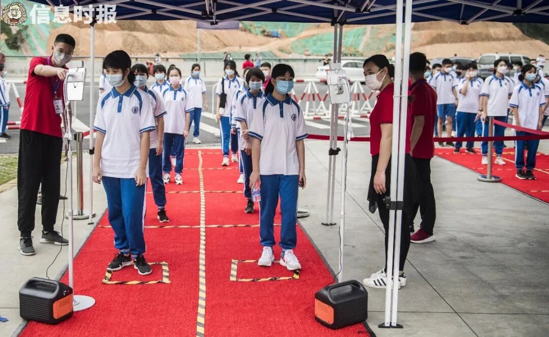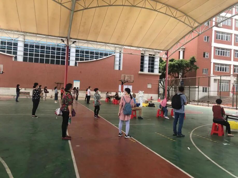 4月21号,黄埔区开始分批分时段对全区中学高三、初三毕业班学生和教职员工进行免费核酸检测,覆盖人数约1.3万人。当天,广州市第八十六中学、广州开发区外国语学校、北京师范大学广州实验学校、广州开发区中学、黄埔崇德实验学校等学校师生职工约3000多人已进行核酸检测采样。4月21日下午,北京师范大学广州实验学校组织266名初三学生返校进行核酸检测。1、学生们都身穿校服。检测前,学生们排成两列,保持1.5米距离,经过AR测温仪检测体温正常,用免洗洗手液消毒后,方可进入校园。