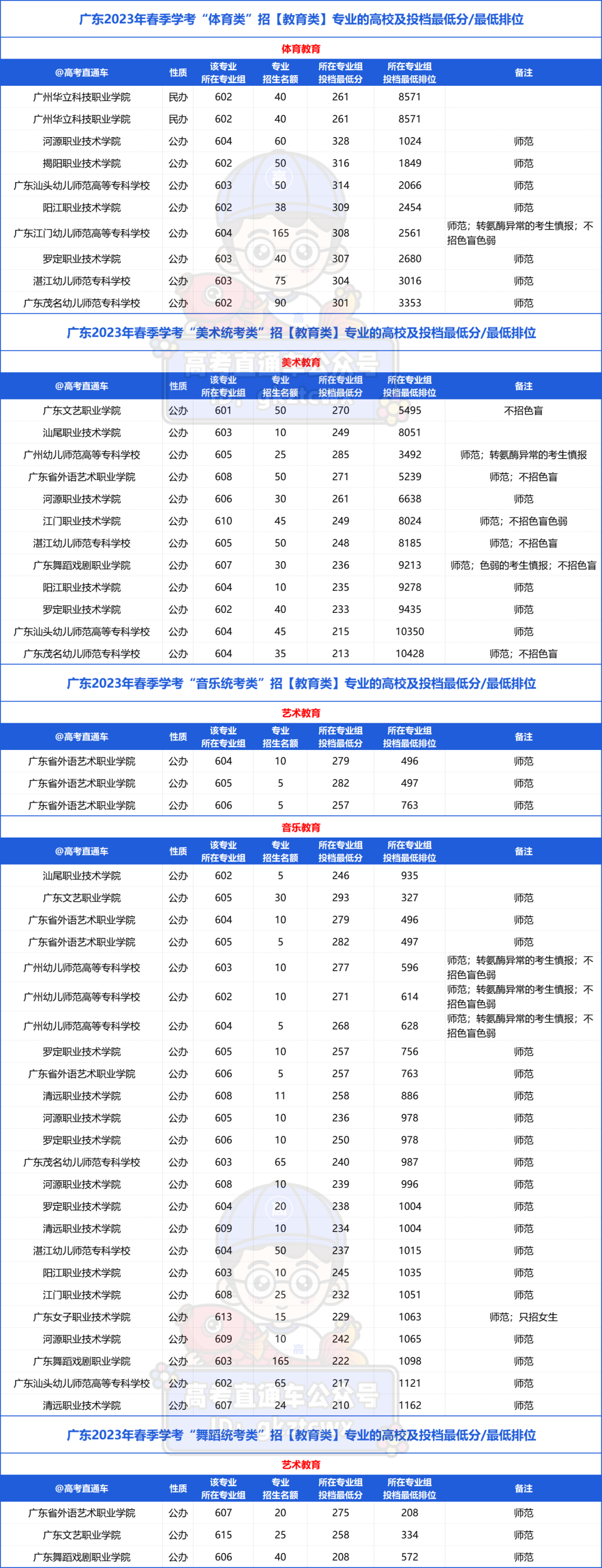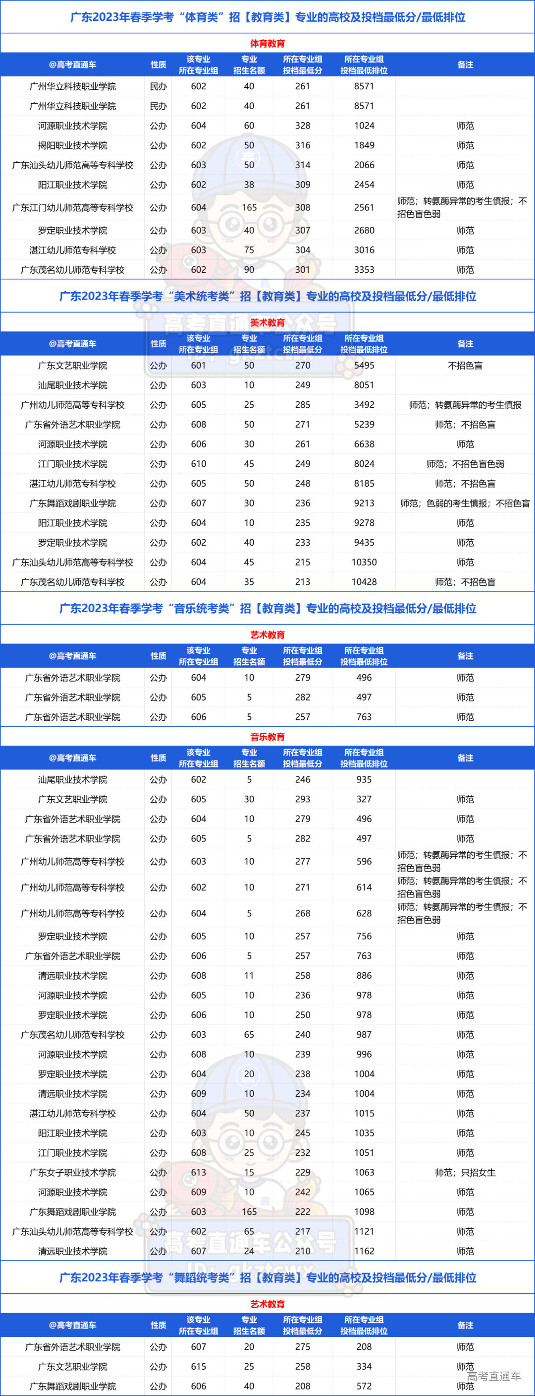 下面,车车为大家分享2023年广东春季高考招“教育类”专业的高校和对应投档情况,一起来看看吧!