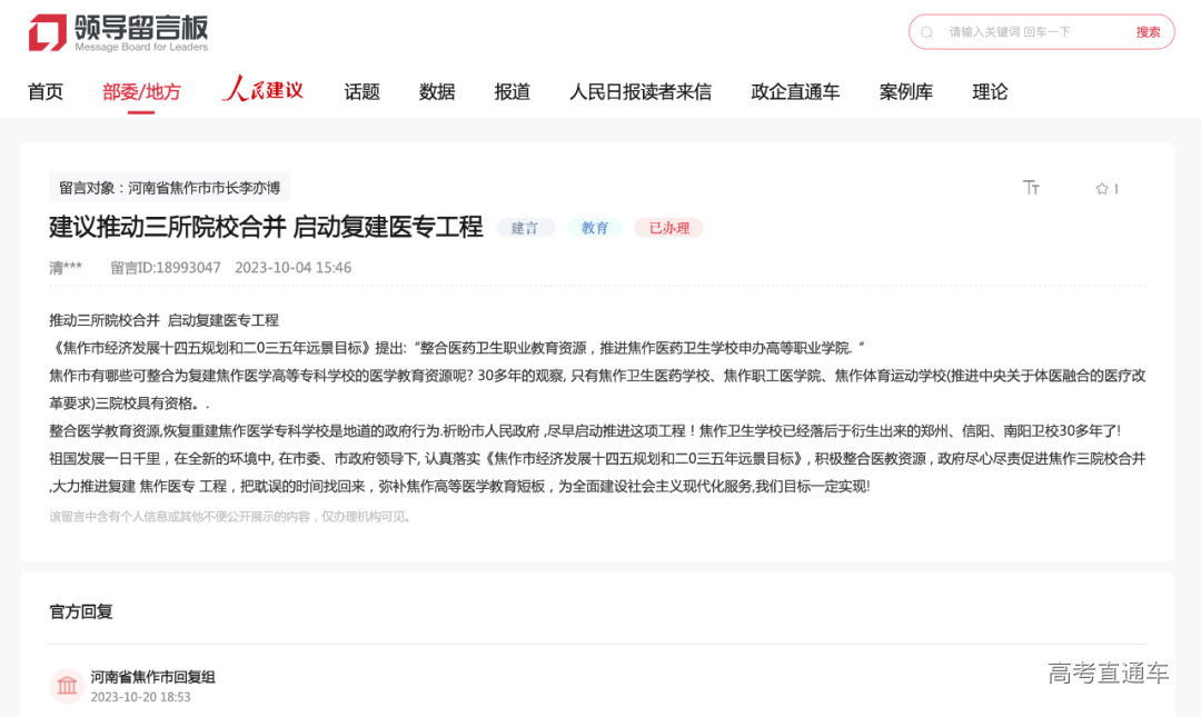 经核查,您提出的三所院校合并,暂时未纳入河南省高等学校“十四五”规划。目前,设置焦作医药职业学院已列入该规划,按照省教育厅有关要求,结合我市实际,计划2024年推进焦作医药职业学院设置工作。