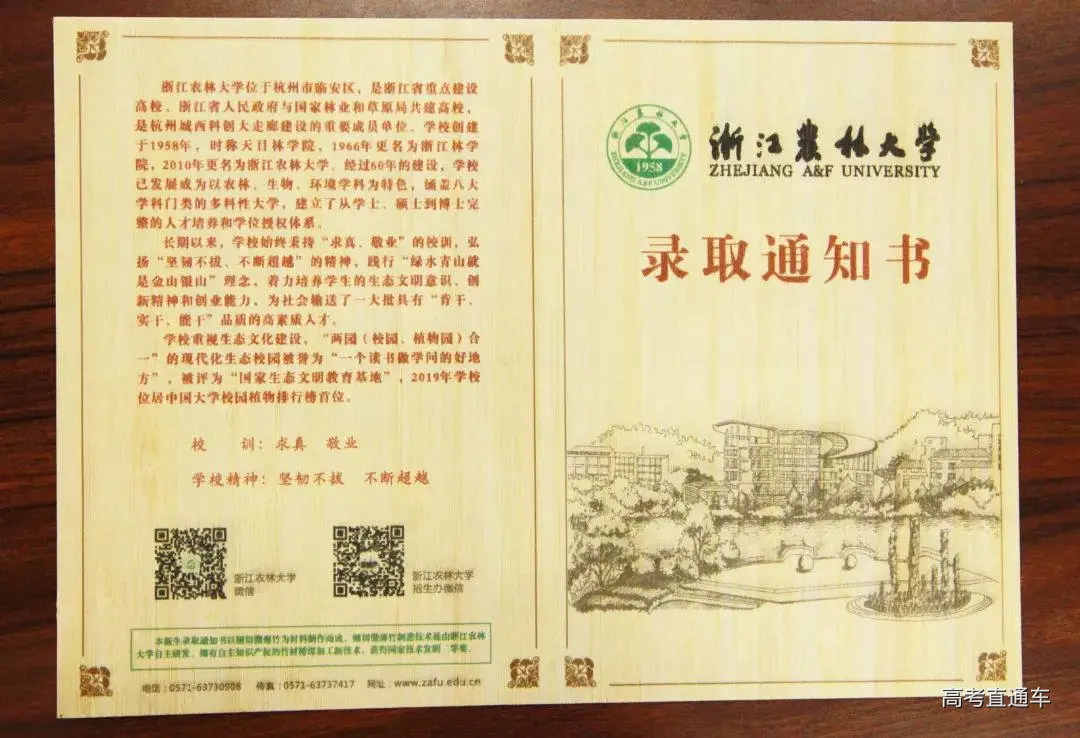 浙江农林大学的录取通知书则非常环保,学校从2015年开始使用该款“最科技”本科新生录取通知书,以毛竹为原材料,运用该校自主研发的刨切微薄竹技术制作并印刷而成,相关技术曾获国家技术发明奖二等奖,被称为“史上最有科技含量的录取通知书”