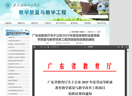 近日,多所广东高校的网站均发布《广东省教育厅关于公布2025年度省高等职业教育教学质量与教学改革工程项目验收结果的通知》。