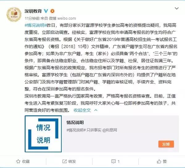 昨日,有部分家长对富源学校学生参加高考的资格提出疑问,我局高度重视,立即启动调查。经核实,富源学校在我市申请高考报名的学生均符合广东省高考报名资格。根据《关于做好广东省2019年普通高校招生统一考试报名工作的通知》(粤招〔2018〕15号)文件精神,广东省户籍学生可在广东省内报名参加高考;如果为非广东户籍,考生(家长)必须具备“两个合法”、“三个三年”的条件,即具备合法稳定职业、合法稳定住所以及学籍、社保、居住证各满三年。根据广东省高考报名的政策规定,我市招考部门对所有报名考生的资格进行了严格审核。富源学校学生(包括户籍在广东省内深圳市外的)均提供了户籍所在地公安部门及我市学籍管理部门对其户籍、学籍的审核证明,手续齐全、资料完整,符合在深圳参加高考的报名条件。