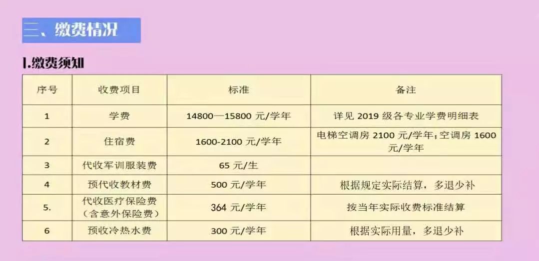 1.请学生在接到录取通知书之日起到报到前七天,将学费、住宿费、教材资料费、医疗保险费、军训服装费、水费等六项费用通过当地的银行转账到学校账户(请在汇款用途注明:2019级 (姓名)的学费),具体账户如下: