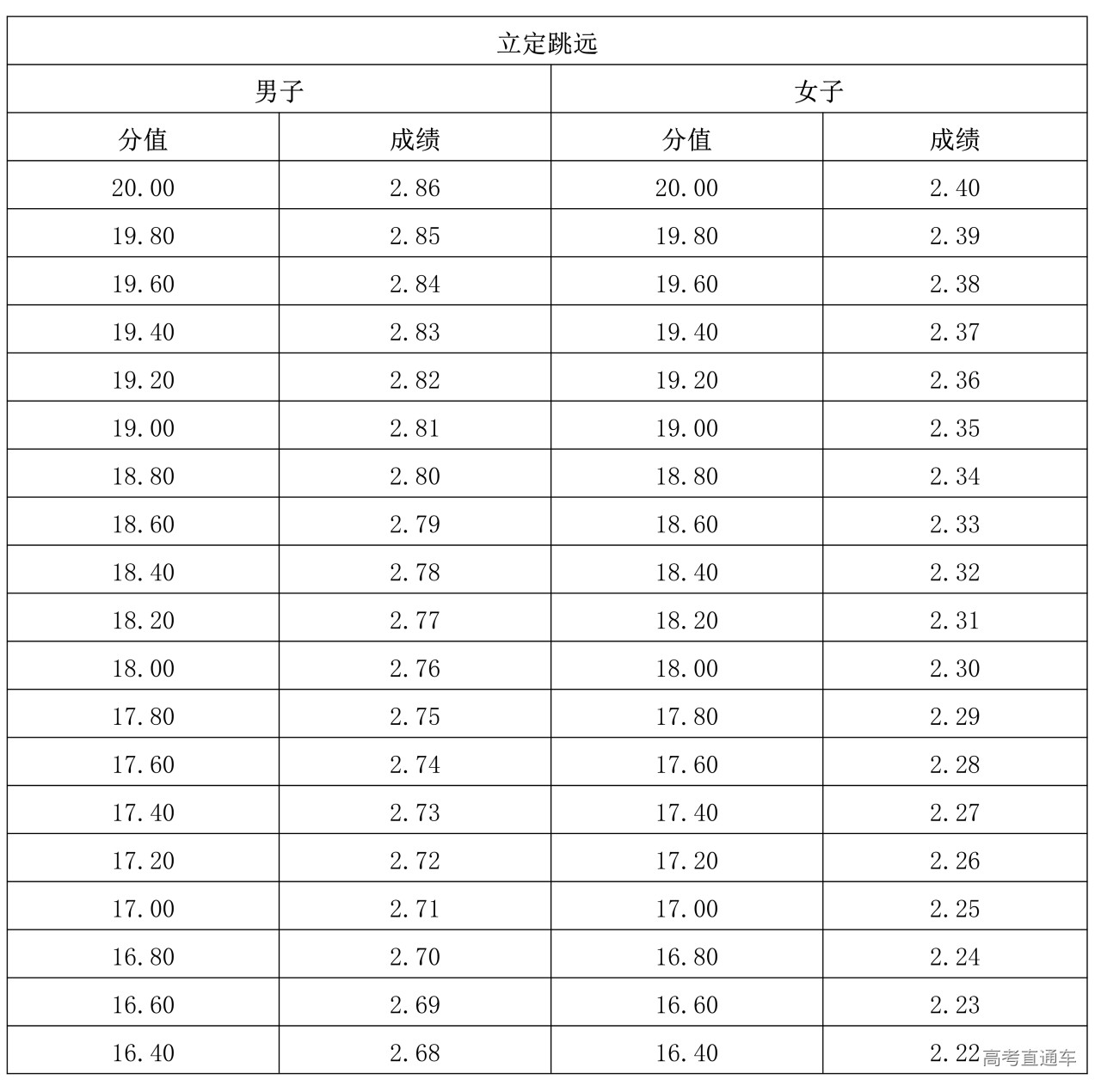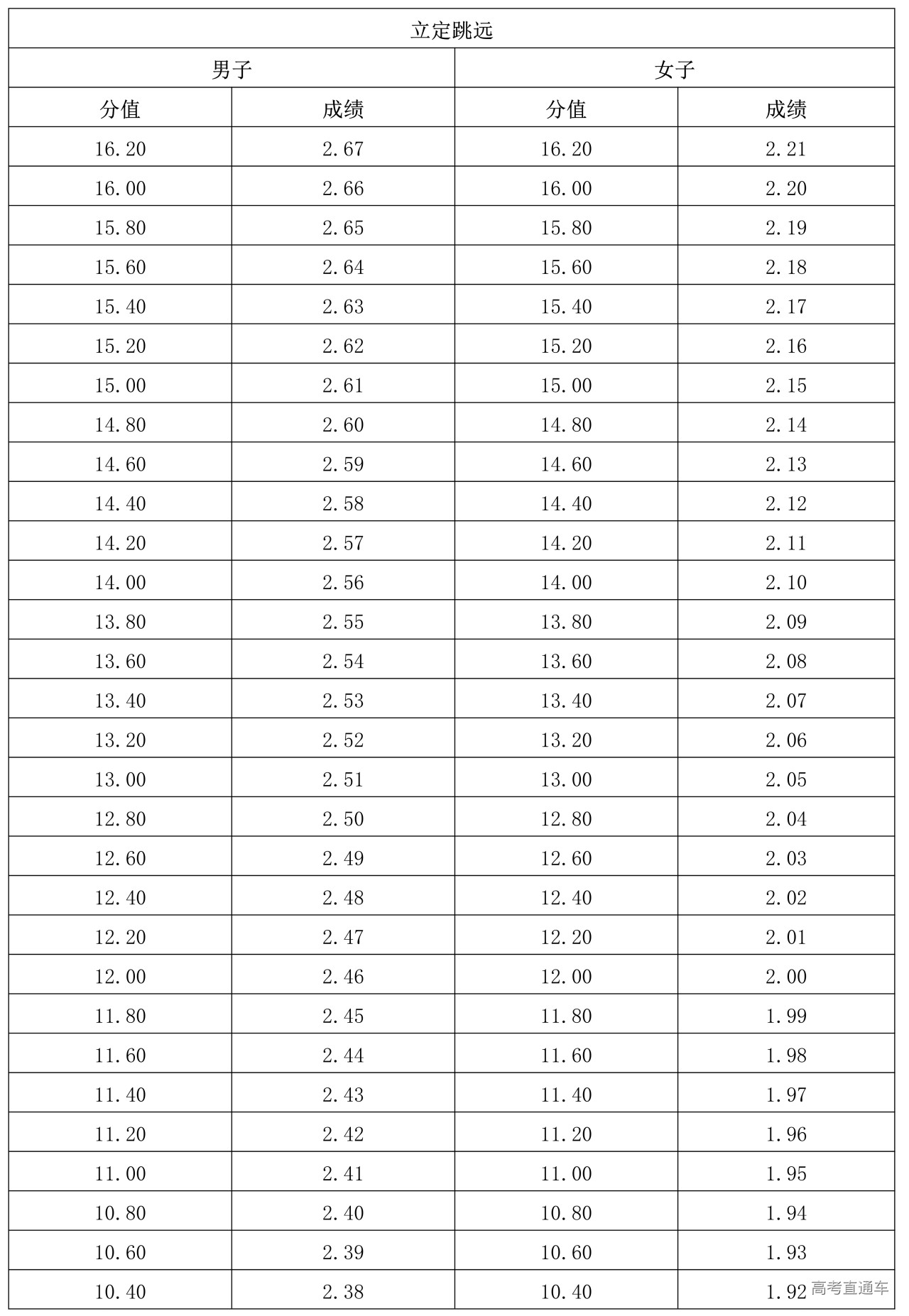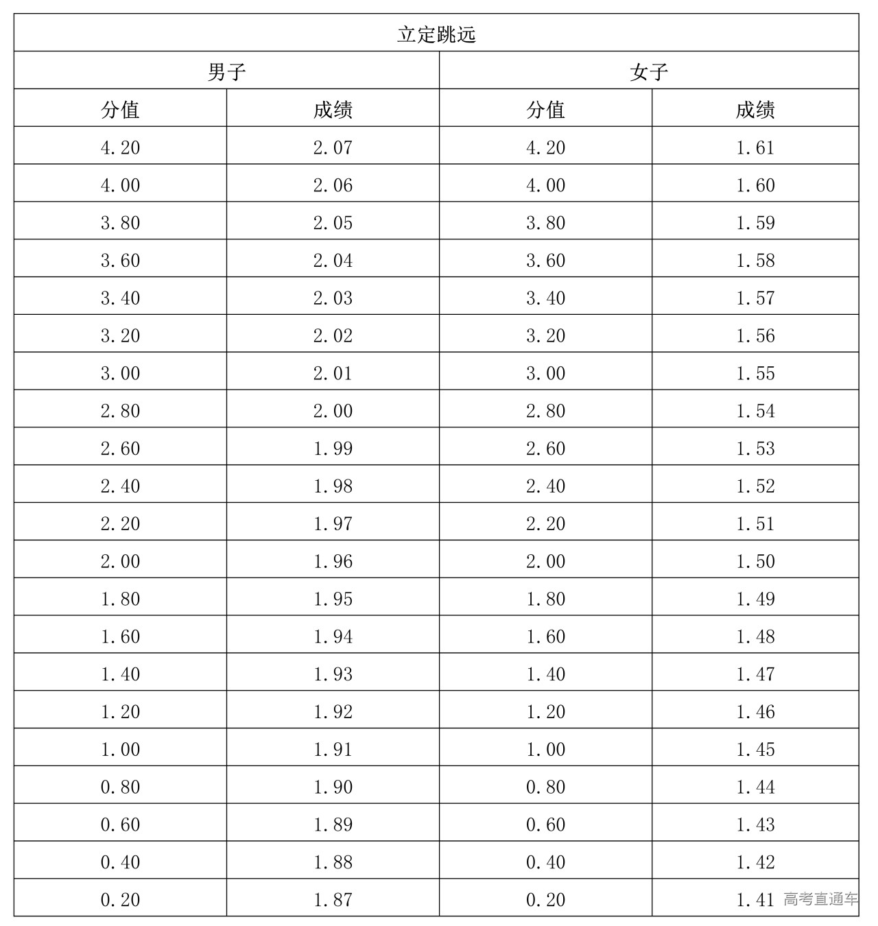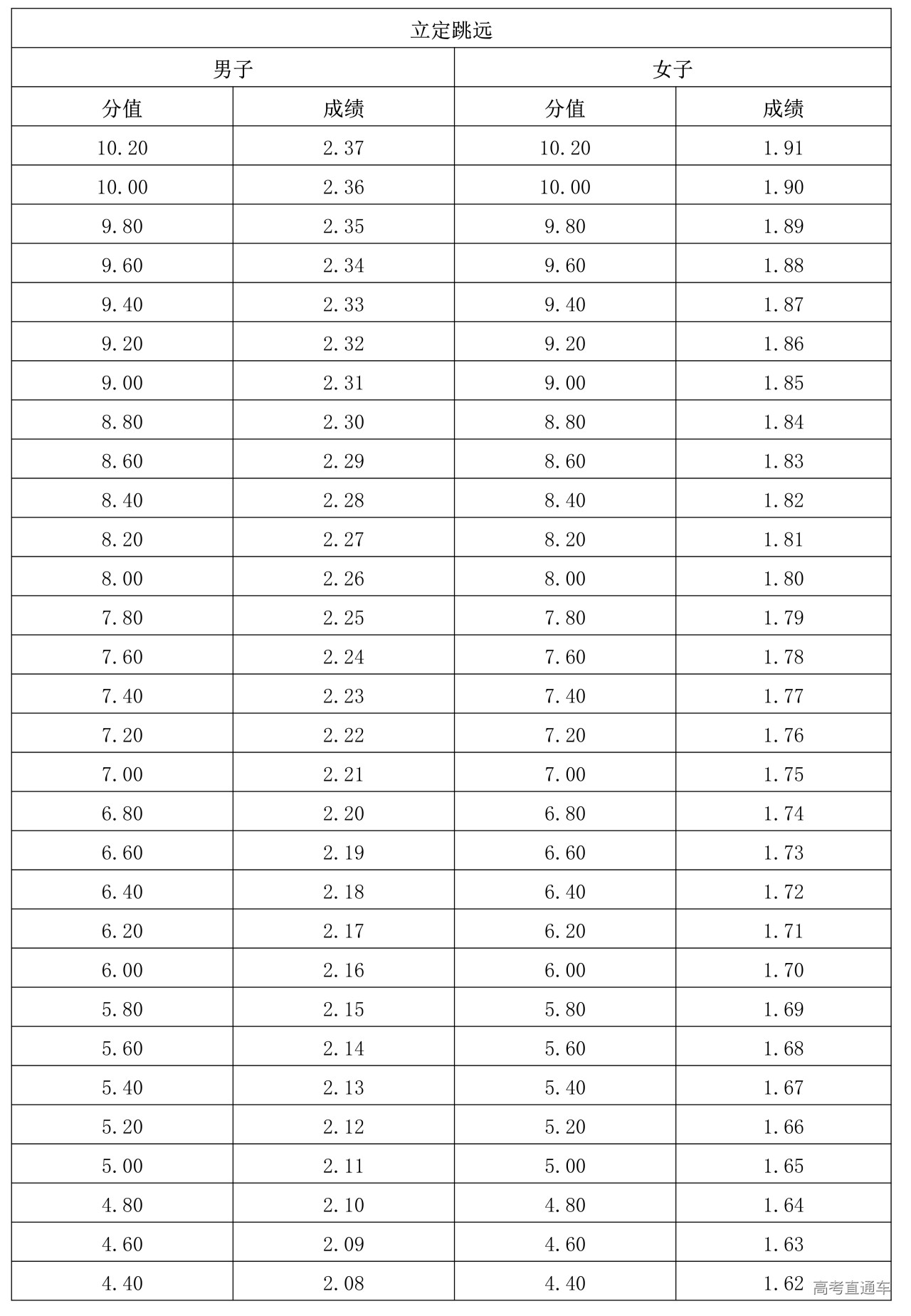 (二)立定跳远评分表(单位:米)