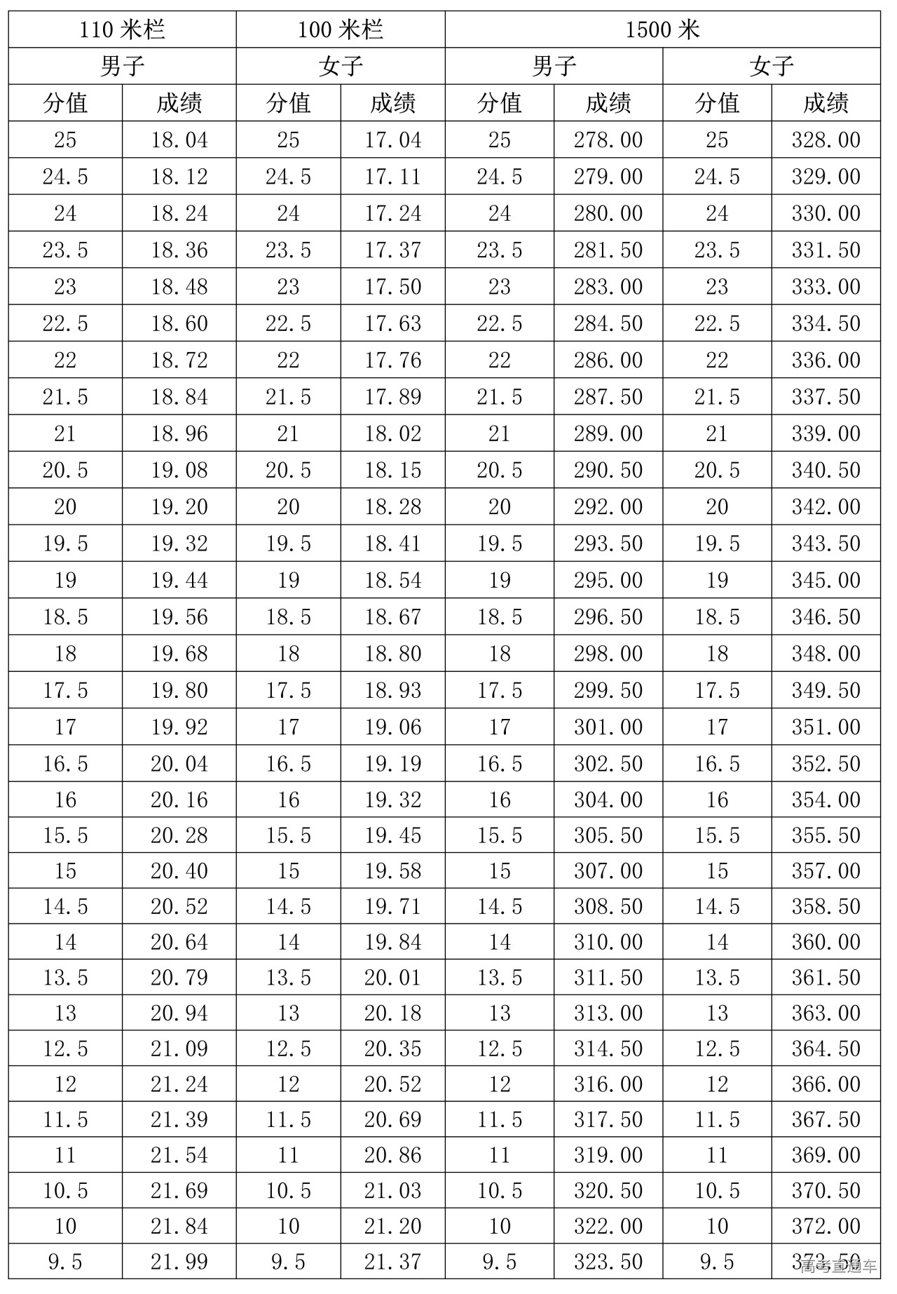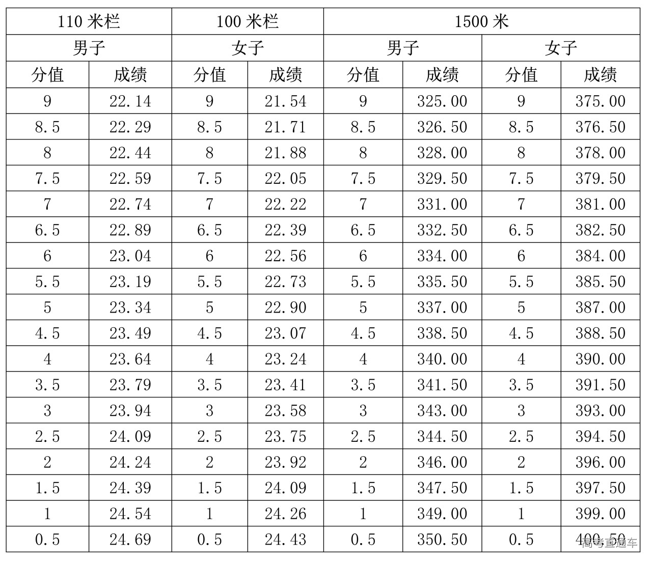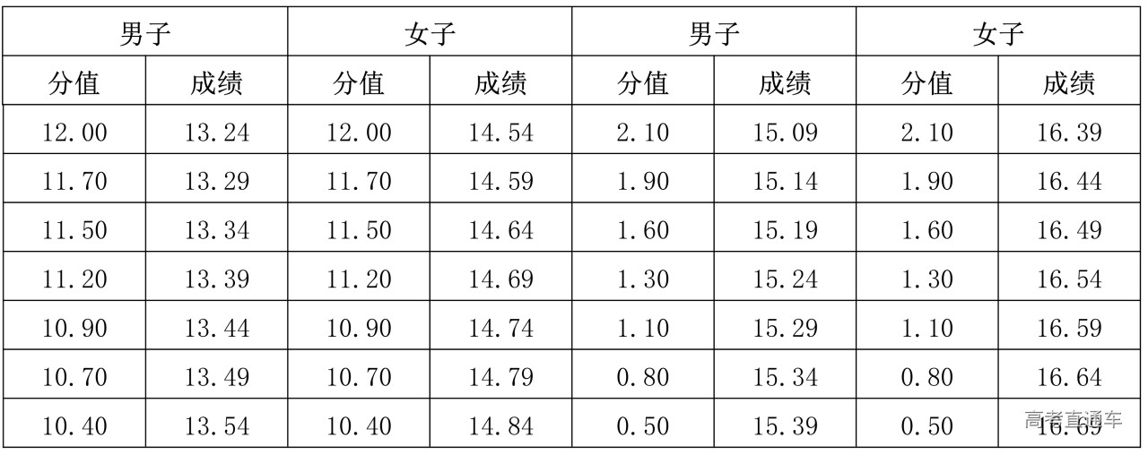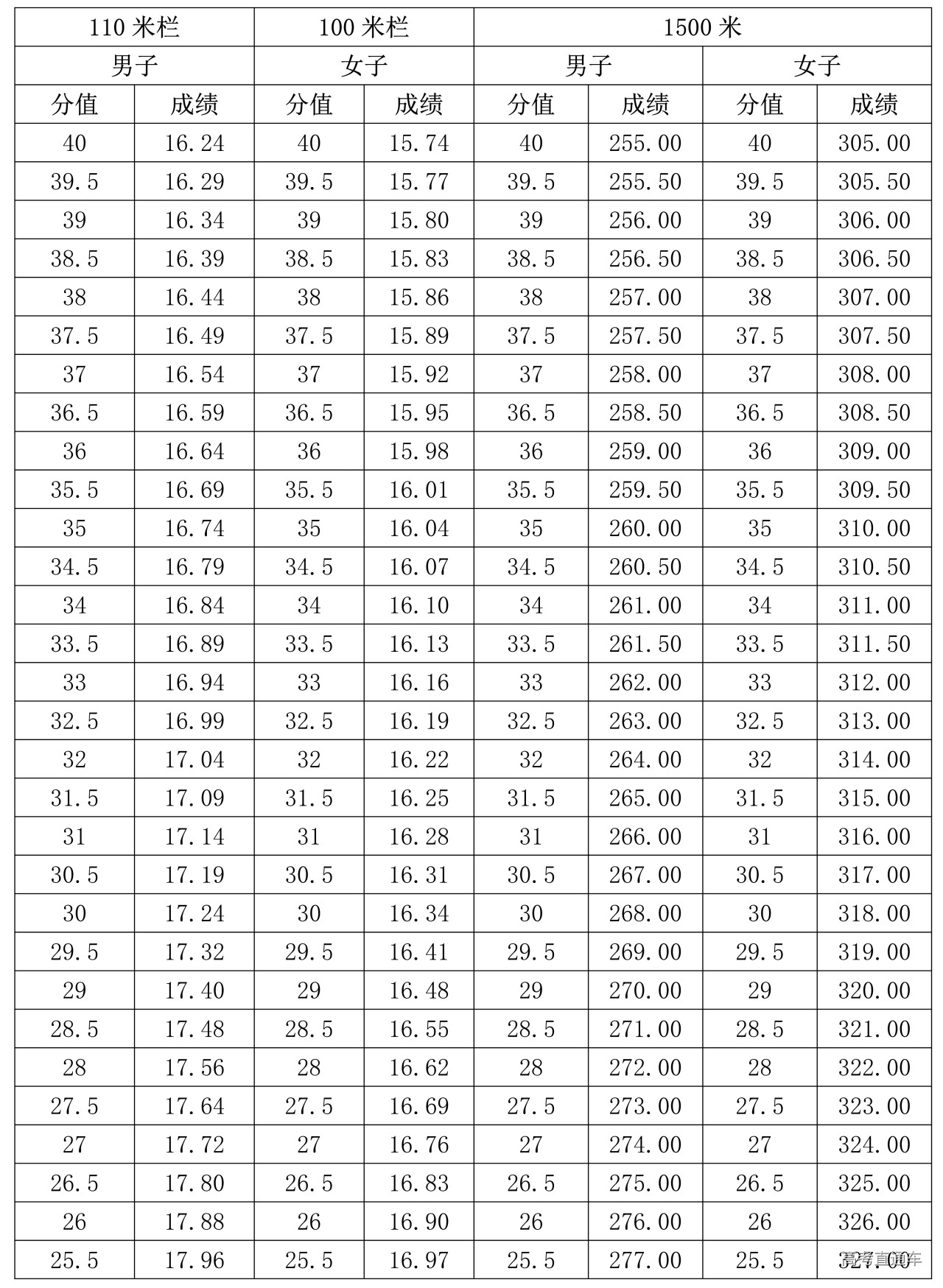 2.男子110米栏、女子100米栏、1500米跑评分表(单位:秒)