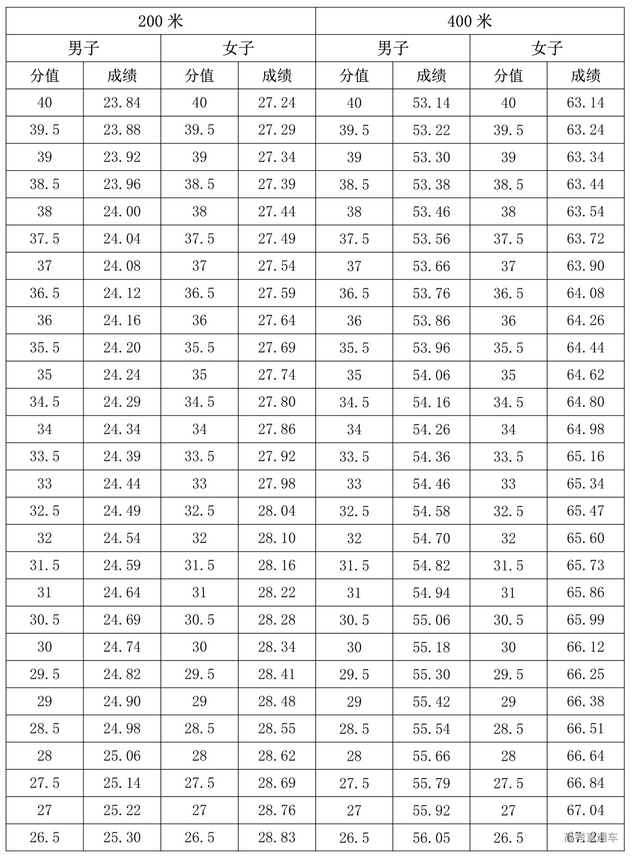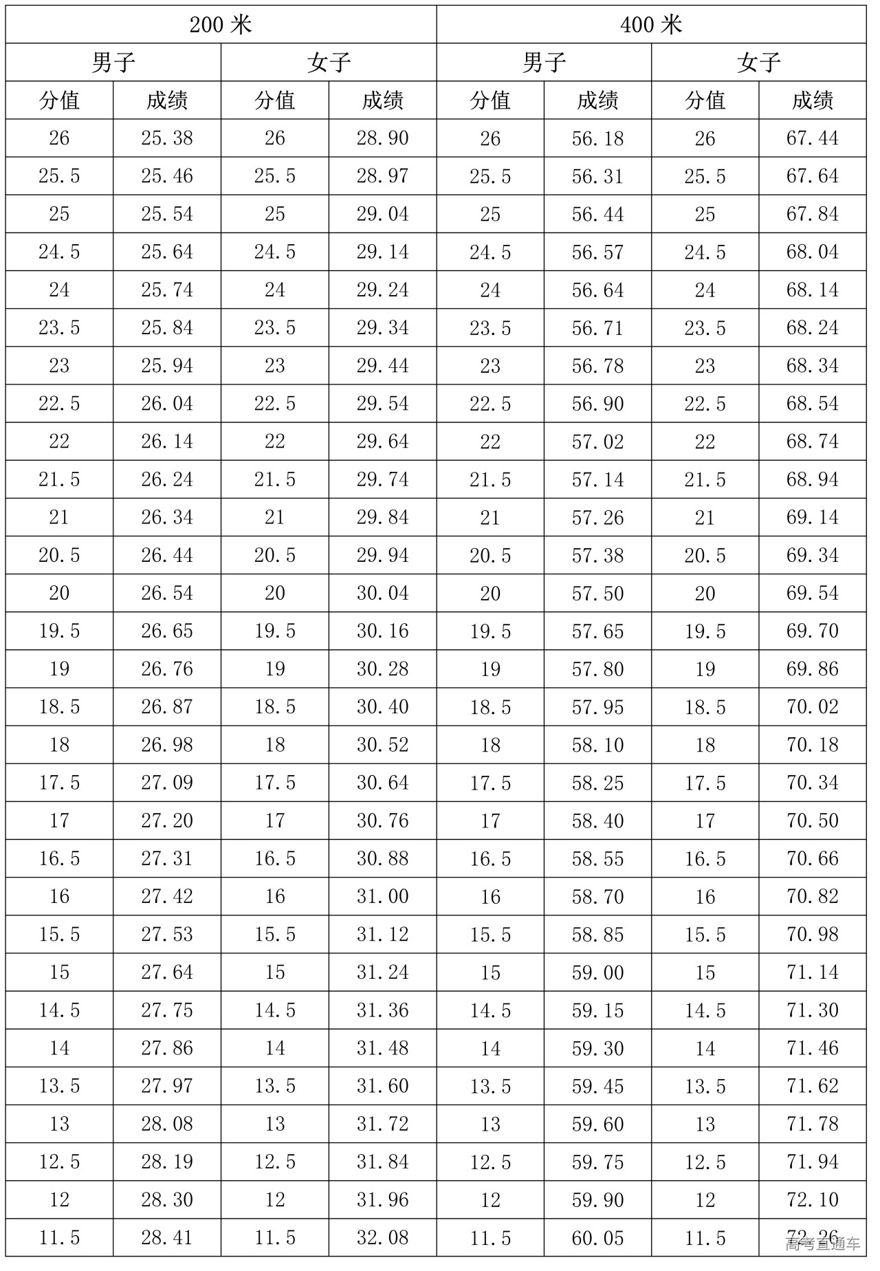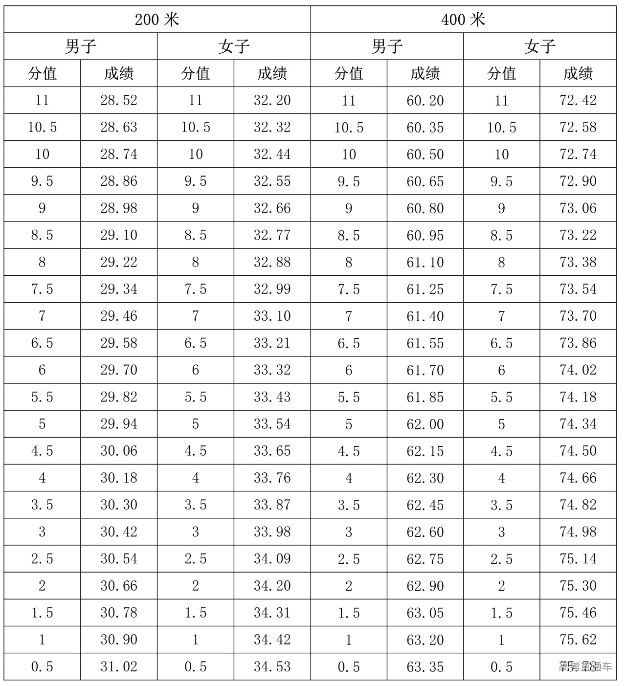 1.200米、400米专项评分表(单位:秒)