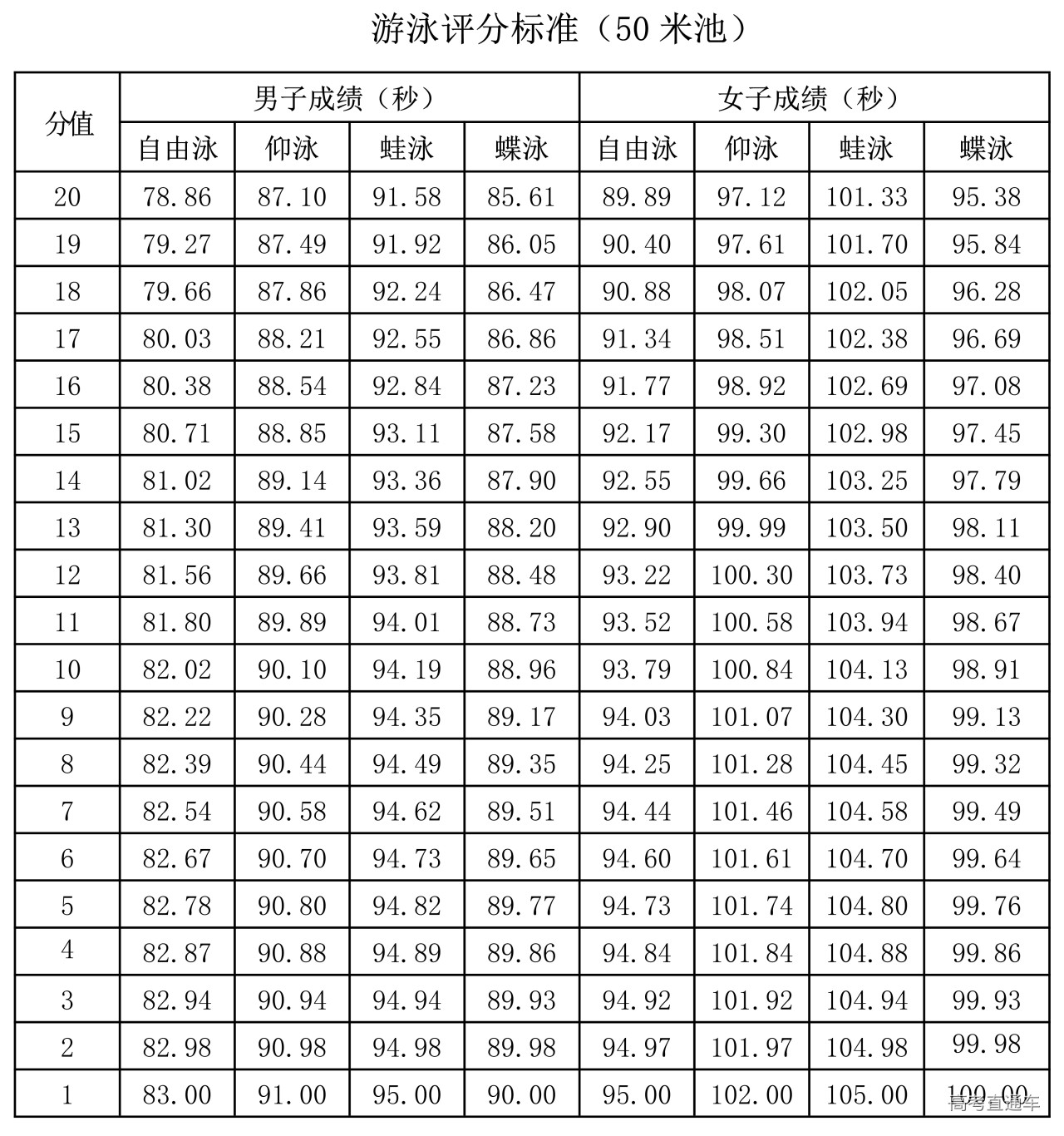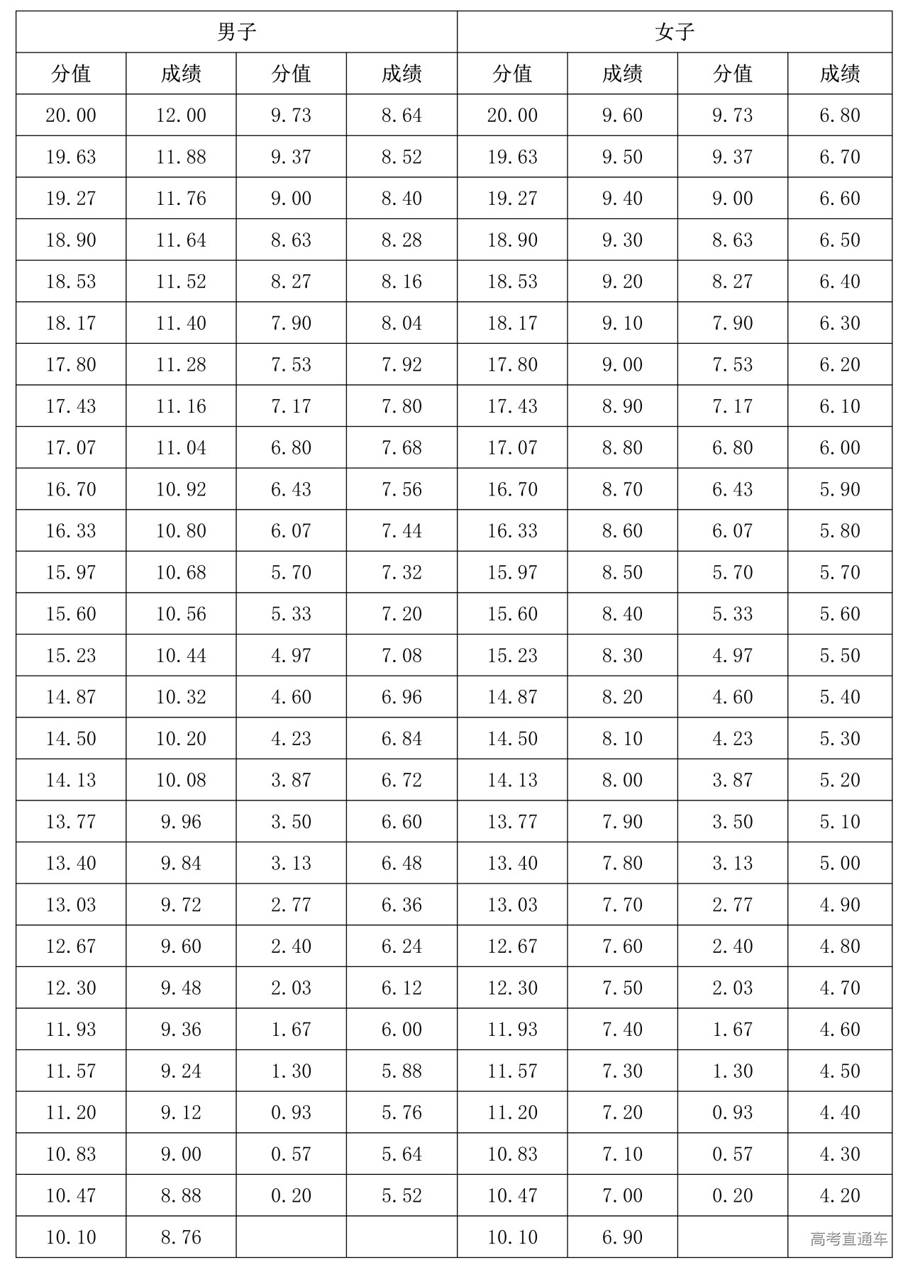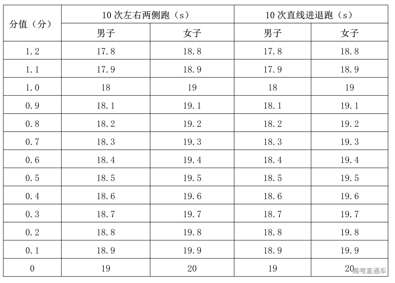 女生仰卧举腿:20次为满分2分,每做一次为0.1分。