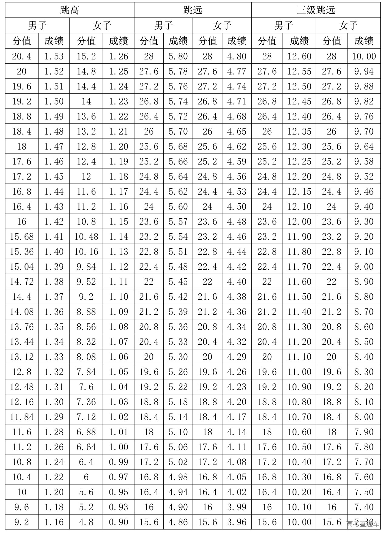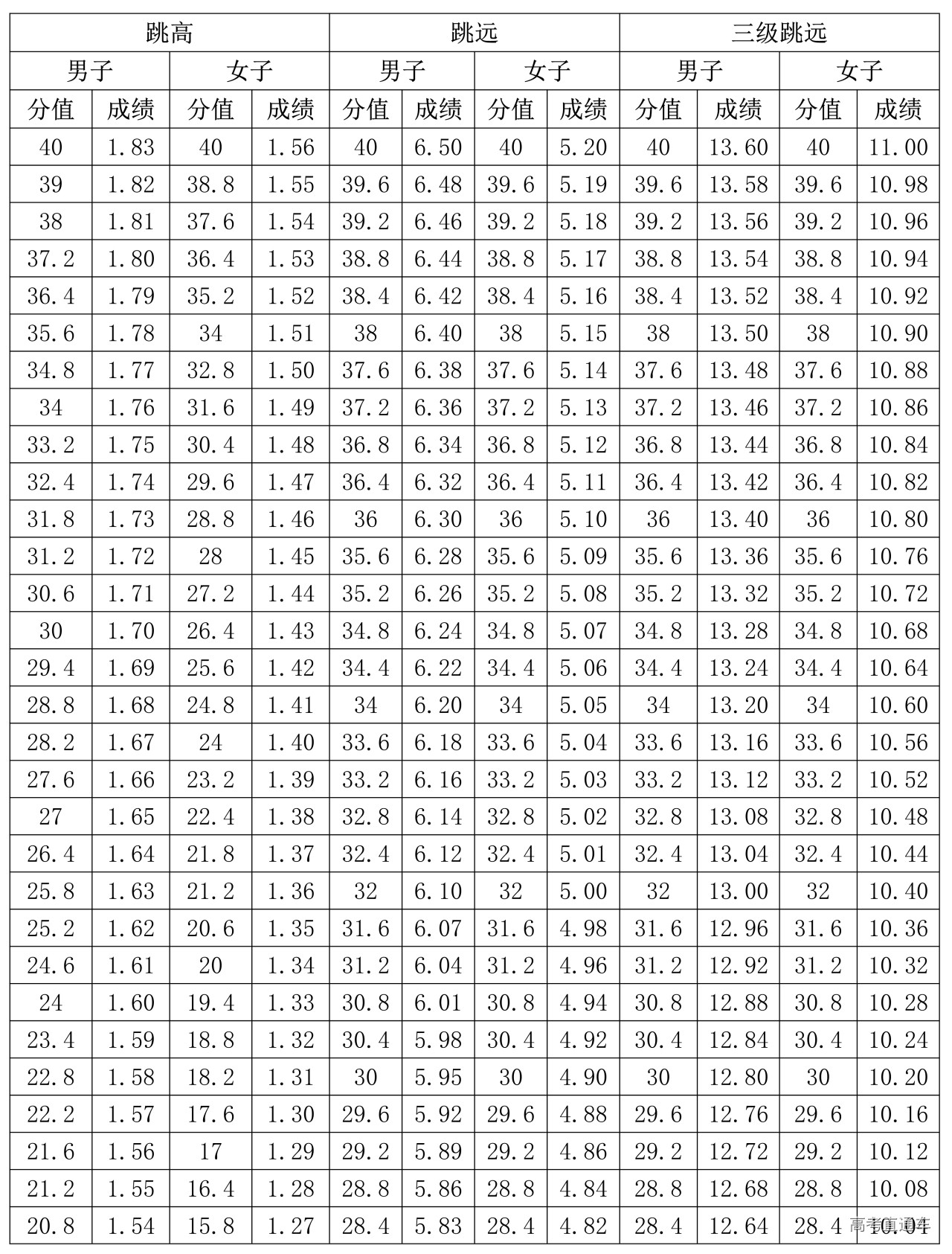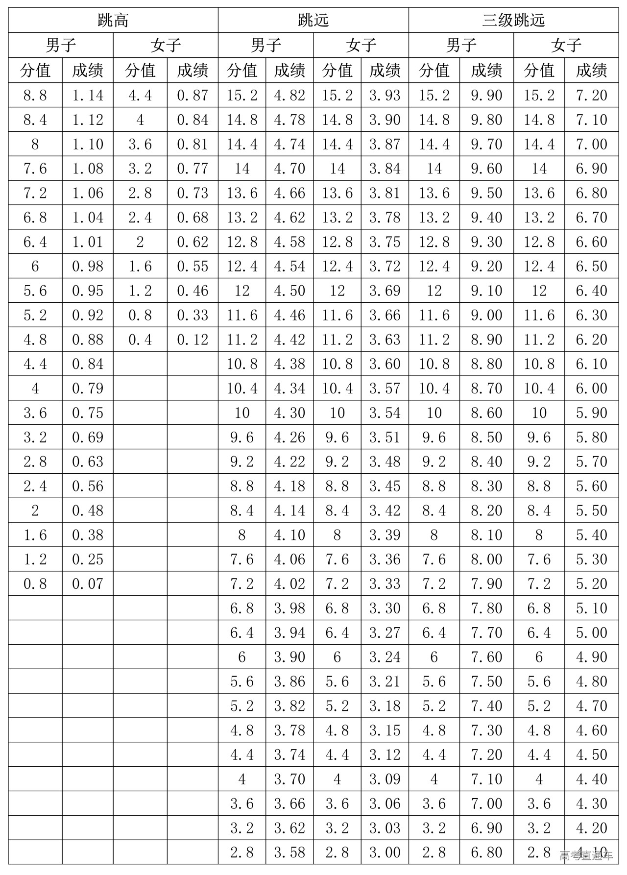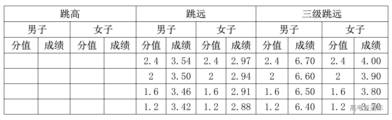 3.跳高、跳远、三级跳远专项评分表(单位:米)