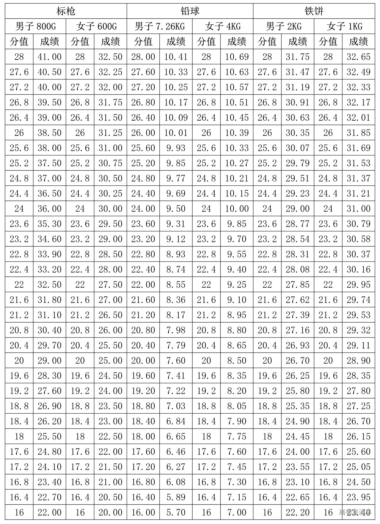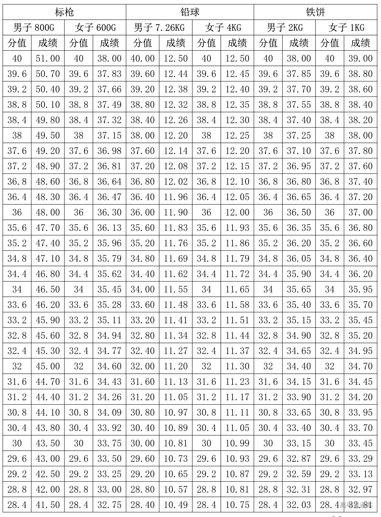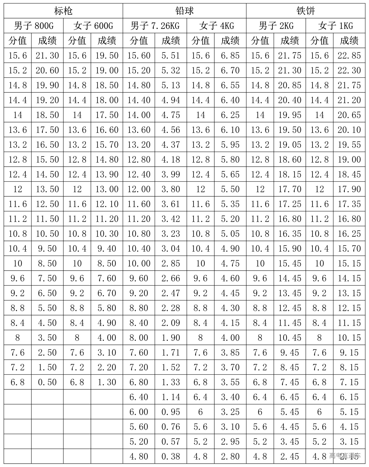4.标枪、铅球、铁饼专项评分表(单位:米)