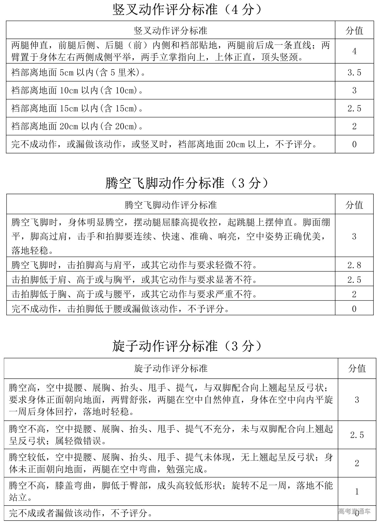 3.体操专项总分按40分计算,其中专项素质占12分,规定动作占28分,自选动作不计分。考生专项素质和规定动作得分的总和即为体操专项总分。