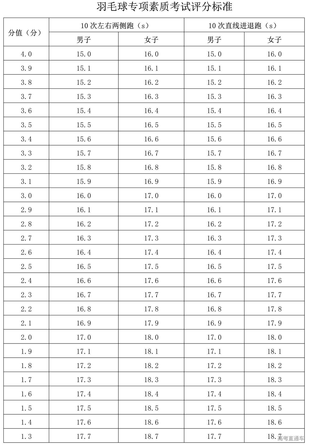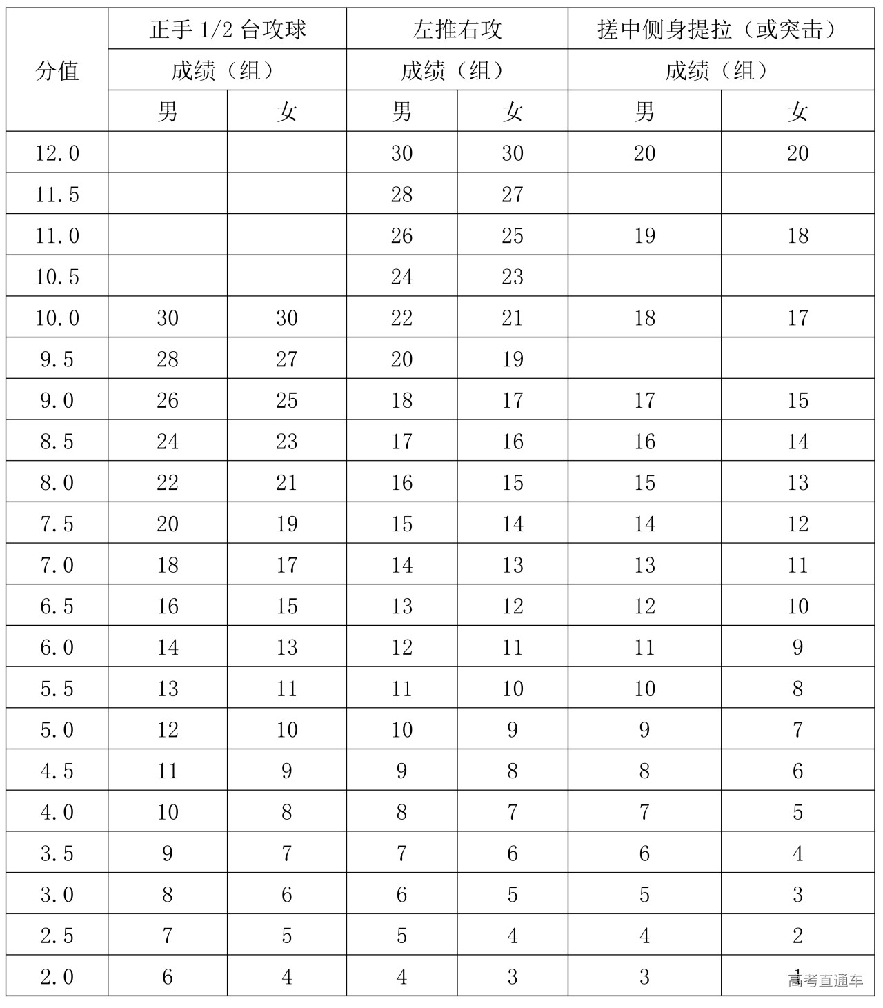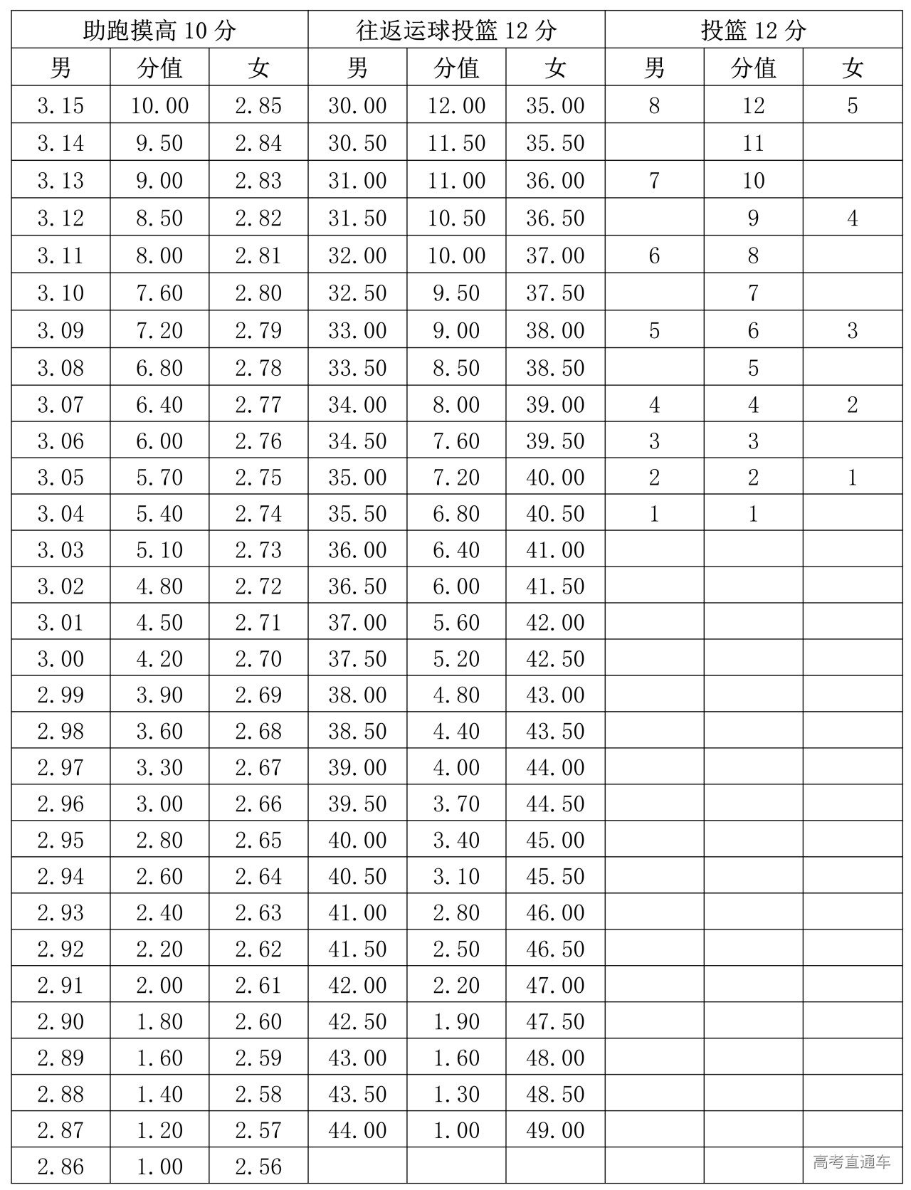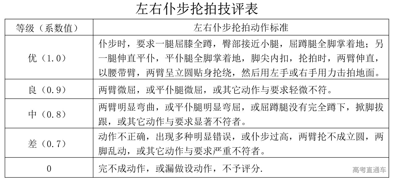 专项素质满分为12分。每项测验内容达到要求者可得评分表规定的满分。达不到要求者视其情况扣分。其中达标项目评分标准为: