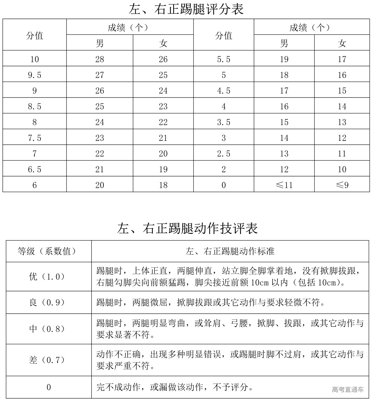 B.左、右正踢腿评分标准和考试方法(10分)