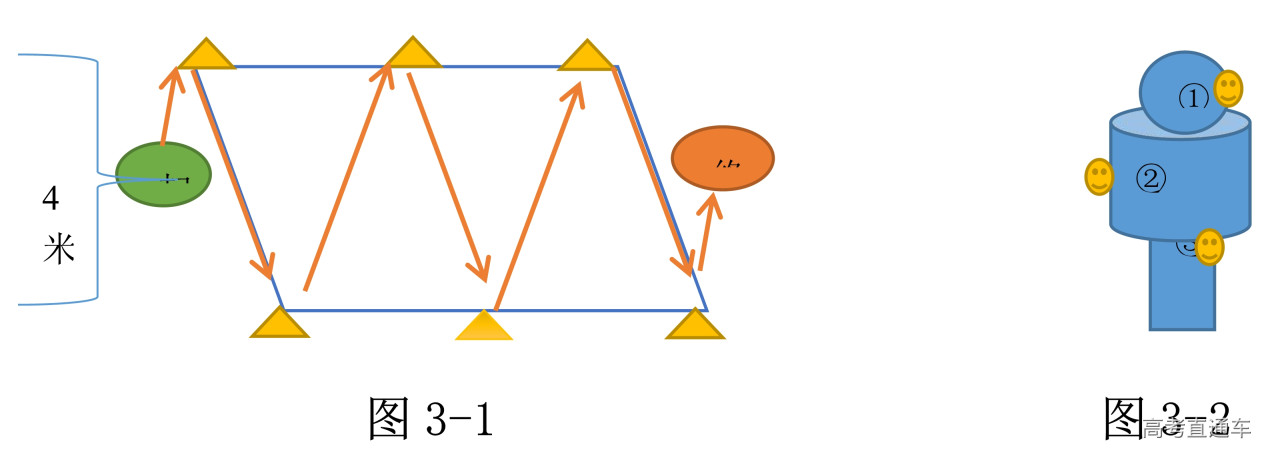 b.考生在起点圈内做好准备后,听口令开始沿箭头分别击打六个固定桩,打完后、任意一只脚踏进终点圈停止计时(图3-1)。图3-2中标示的①②③为打击的三个位置,打击顺序不限。