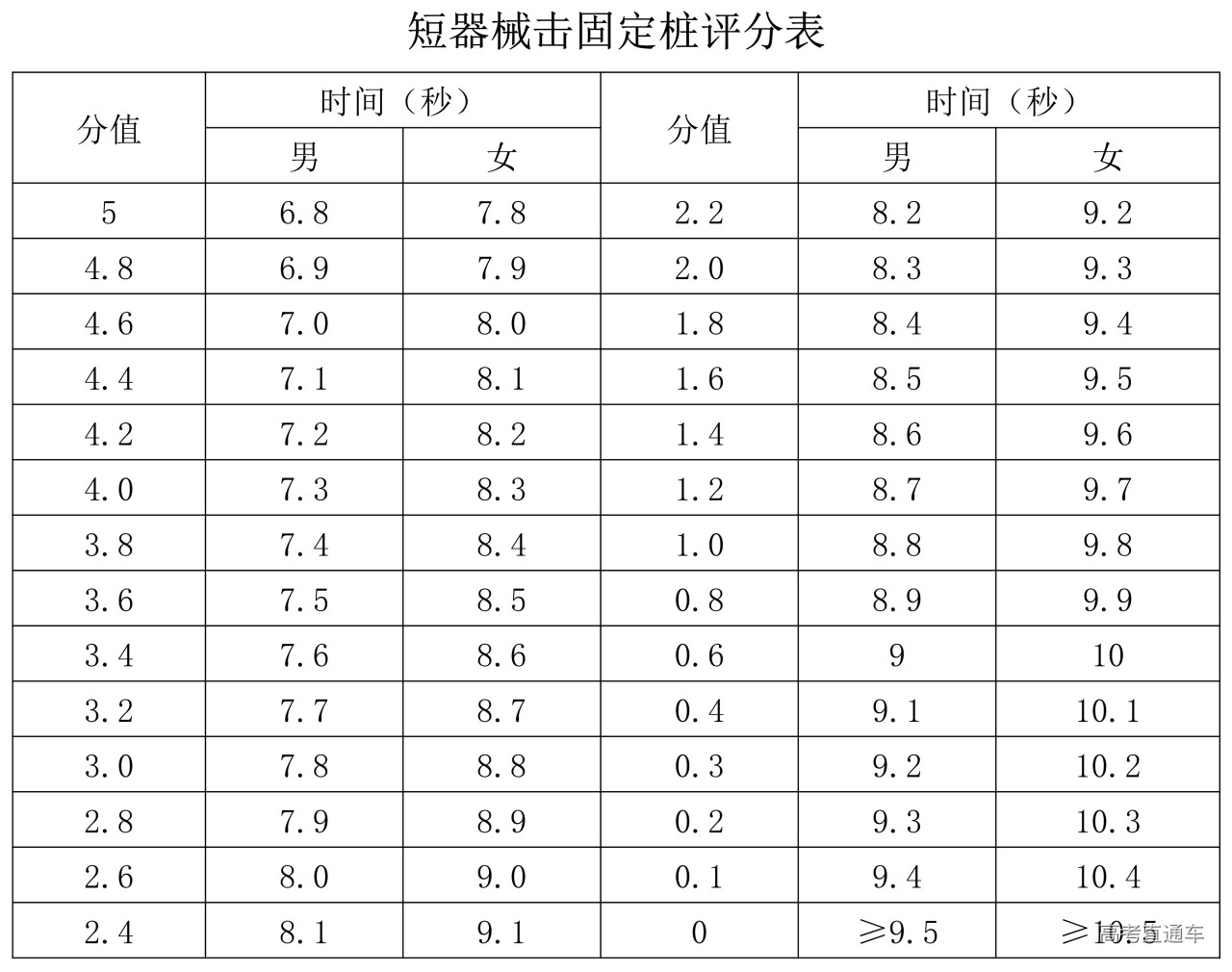 a.用器械(短兵)全长90cm,打六个固定桩(桩高170cm、直径40cm)。固定桩分成两排,一排三个,两排距离4米,每两个相邻桩距离2米,成“Z”字形排列。每个桩分别打头、躯干、大腿三个固定点。考生站在出发台前,前脚踏住计时启动器,准备好后听口令自己启动计时器,按顺序打完三个桩的固定点后,自己停计时器,回到出发台。所用时间换算成分数就是考生的最终分数,每个考生考2次,取最好成绩。考生打桩所用的移动方法不限,漏掉任意一个点扣1分,依次递减,直至清零,得分标准和考试方法见下表。
