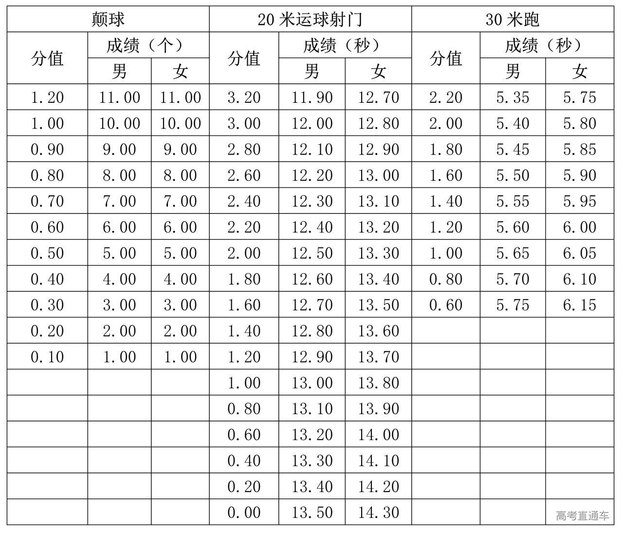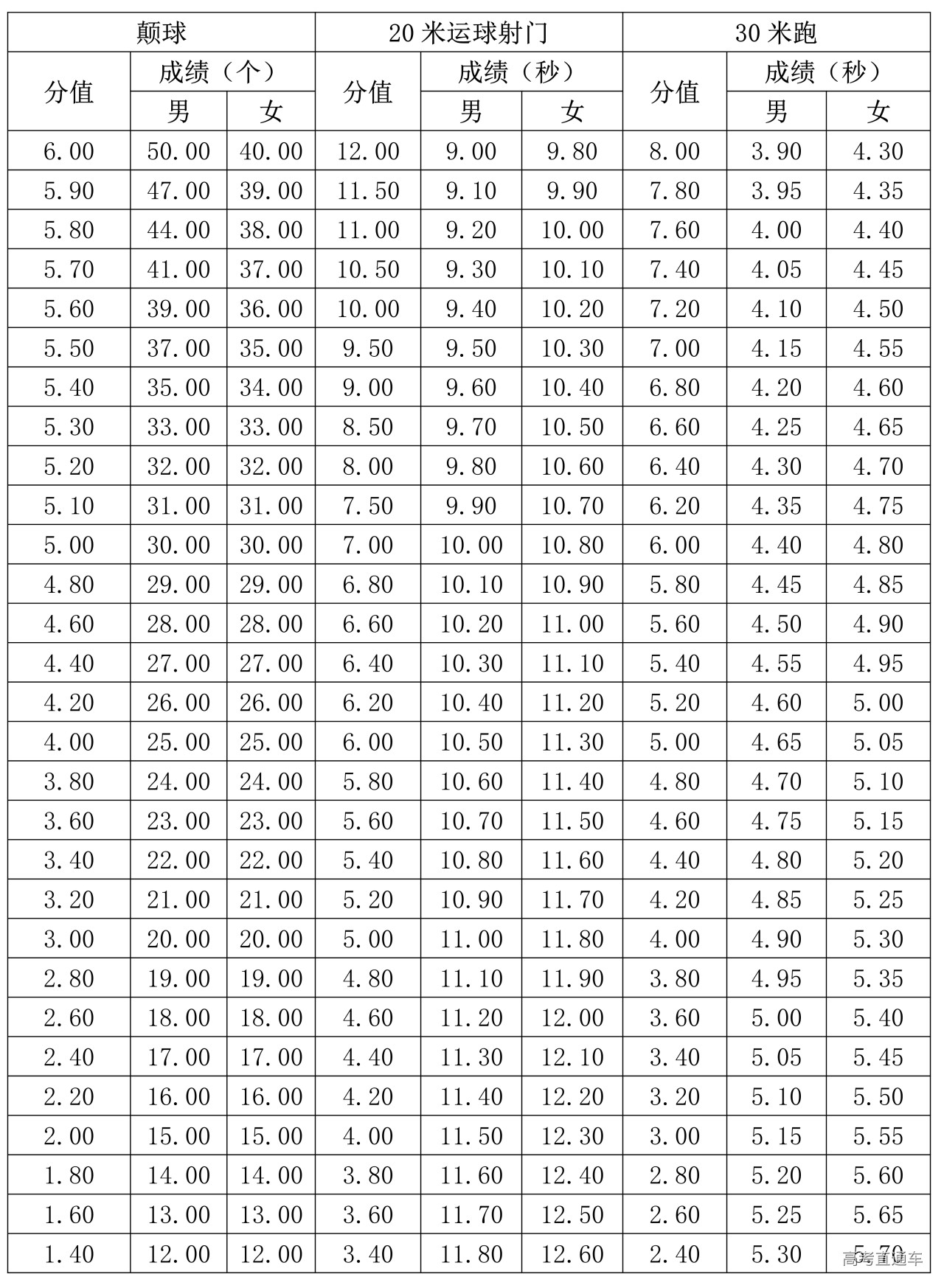 1.颠球、20米运球射门、30米跑定量评分表